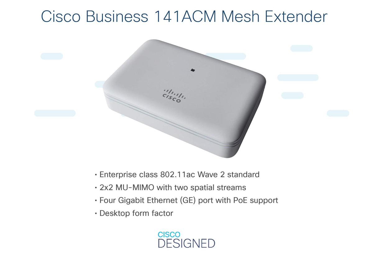 The Cisco Business 141Acm Mesh Extender Seamlessly Works With Cisco Business Wireless Access Points To Provide Expanded Wi-Fi Coverage And Capacity Without Sacrificing Performancethis 2X2 Mesh Extender Comes With An Easy-To-Install Desktop Form Factor With Four Gigabit Ethernet Ports, Ideal For Small Office Suites