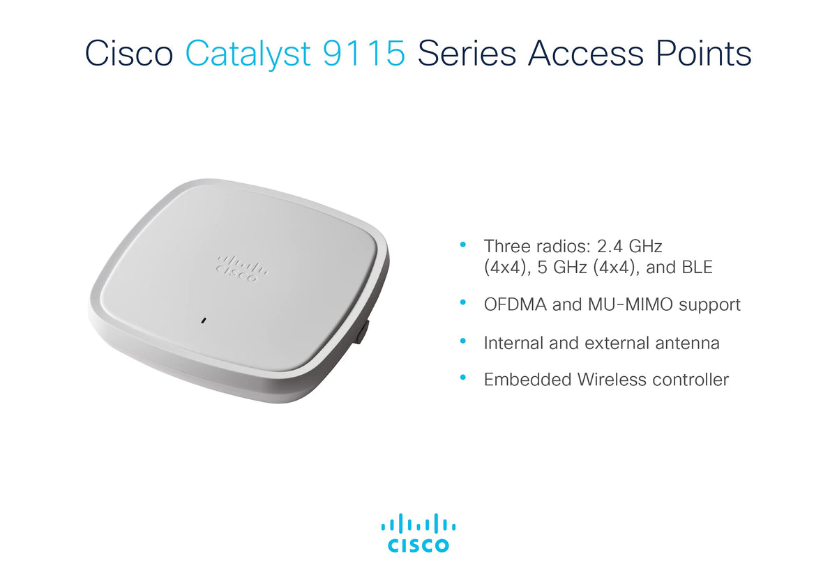 The Cisco Catalyst 9115 Access Points Go Beyond The Wi-Fi 6 (80211Ax) Standard, Providing Radio-Frequency Excellence For High-Density Environments These Access Points Are Resilient And Intelligent While Providing Integrated Security For Mobile And Iot Devices Ideal For Small To Mid-Size Networks Pairing With Cisco Dna, It Further Offers Real-Time Analytics, Quickly Detect And Contain Security Threats, And A Networkwide Consistency Through Automation And Virtualization