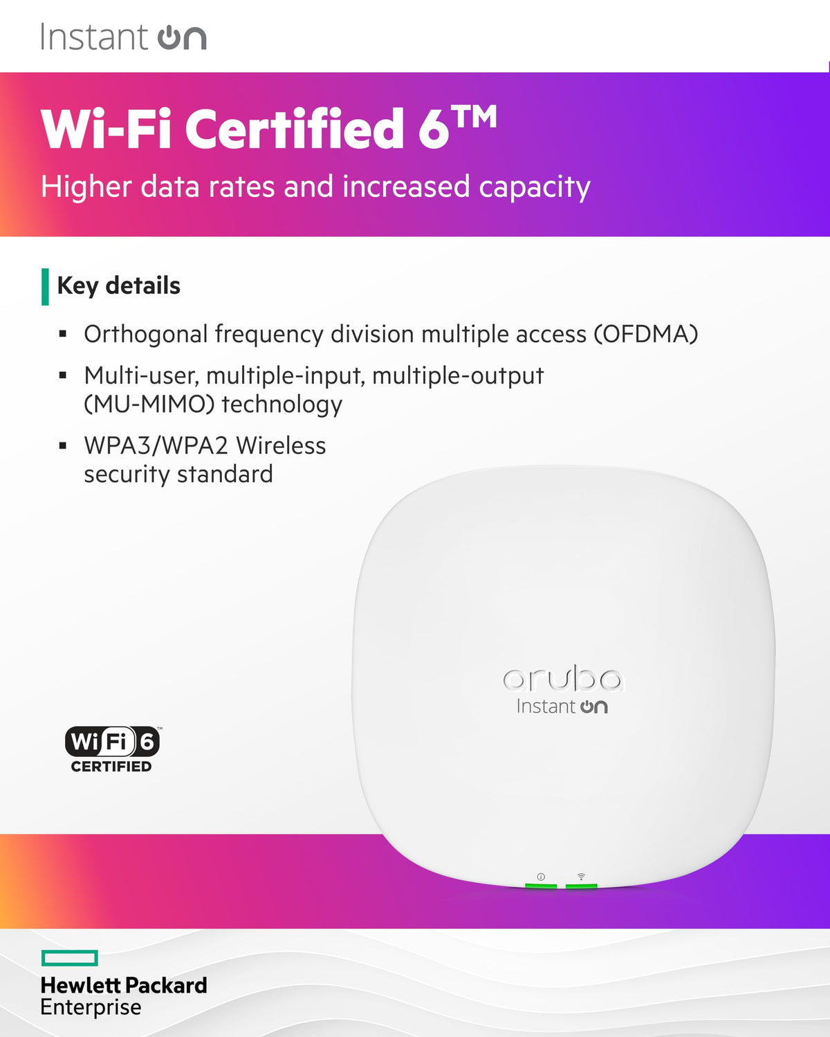 Hpe Networking Instant On Access Points Ap25 Wi-Fi Certified 6 Access Points Deliver Faster Wi-Fi Speeds, Greater Capacity, And Reduced Latency Between Access Points And Devices For A Superior Wi-Fi Experience. These Are Wi-Fi Certified 6, Complying With The Rigorous Interoperability Standards Established For Wi-Fi 6. Access Points Are Dedicated Wi-Fi Devices Used To Deliver Enhanced Wi-Fi Across A Facility, To Reach All Areas Needing Wireless Connectivity. This Technology, Common In Large Companies, Colleges, And Universities, Is Now Available For Smaller Businesses And Smbs Looking For Strong Wi-Fi In Their Facilities. The Instant On Ap25 Is The Business-Class Access Point Solution For You. Wi-Fi Performance Is Increasingly Critical To Business Success, And Network Downtime Can Affect The Bottom Line. The Instant On Ap25 Is Ideal For High-Density Environments, With 4X The Capacity Of 802.11Ac Access Points, It Provides An Exceptional User Experience, Allowing Businesses To Serve More Customers With Higher Speed And Less Congestion. We�Ve Made It Easy To Keep Wi-Fi Users Happy, Mobile Devices Connected, And Your Network Secure. The Instant On Access Points Work Together In Concert, With Shared Security Access And Presenting A Common Network Across Your Facility. Setting Up Employee And Guest Networks Is A Breeze. Smart Mesh Wi-Fi Makes It Easy To Cover Rooms Difficult To Reach With Wires. Whether You Own A Small Retail Store, A Busy Bed-And-Breakfast, Or A Professional Office Location, Wi-Fi Plays Such A Critical Role Today. Instant On Access Points Are Easy To Deploy And Manage � At An Attractive Price Point. The Instant On Access Points Models Can Be Mixed In The Same Network. Everything From Mounting Hardware To Easy-To-Use Web And Mobile App Management Tools And Business-Grade Software Features Are Included