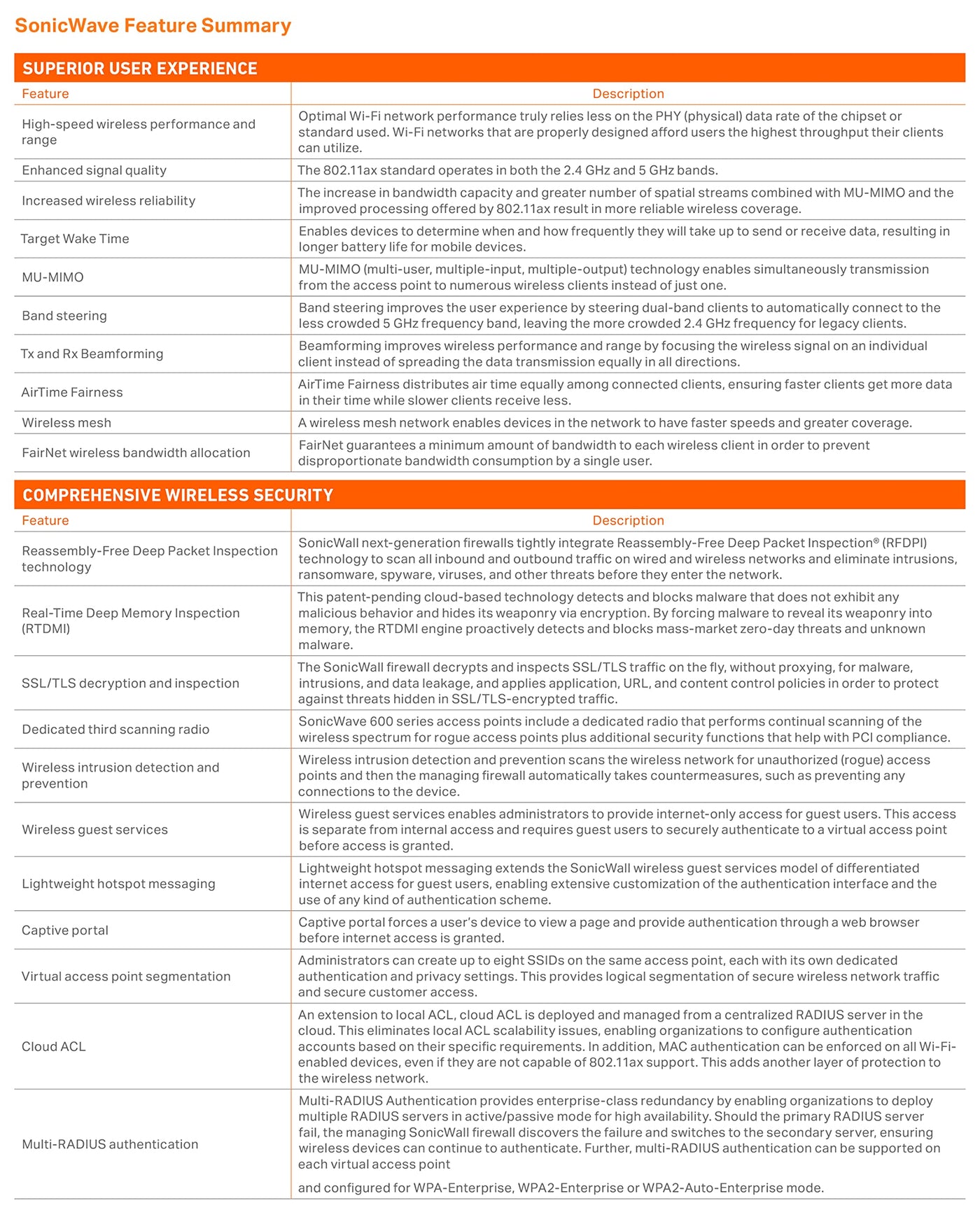 Sonicwave 621 Wireless Access Point Secure Upgrade Plus With 3Yr Secure Cloud Wifi Management And Support (No Poe) (03-Ssc-0718) Performance Sonicwalls Sonicwave 600 Series Access Points Utilize 802.11Ax Technology, Which Provides For Improved Performance In High-Density Environments. The Use Of 1024 Qam Allows More Data To Pass Through, And 802.11Ax Provides Improvements In Mu-Mimo, With Both Uplink And Downlink Capabilities. Additionally, 802.11Ax Works In Both The 2.4 Ghz And 5 Ghz Bands, And Latency Is Reduced By 75%. The Result Is An Overall Throughput Improvement Of Up To 400%, With A Nominal Data Rate Improvement Of 37% Compared To 802.11Ac Wave 2. Enhanced User Experience Sonicwave Aps Enhance The User Experience In A Number Of Ways. Not Only Are Processor Speeds Faster, But Beamforming Allows For A More Direct Connection That Is Faster And More Reliable Than Without Beamforming. Also, Improved Power Control Methods Help To Avoid Interference With Nearby Networks, Making For A Better Experience, And Target Wake Time Management Allows For Longer Battery Life For Mobile Devices. Best-In-Class Wireless Security Sonicwall Firewalls Scan All Wireless Traffic Coming Into And Going Out Of The Network Using Deep Packet Inspection Technology And Then Remove Harmful Threats Such As Malware And Intrusions, Even Over Ssl/Tls Encrypted Connections. Other Security And Control Capabilities Such As Content Filtering, Application Control, Intelligence, And Capture Advanced Threat Protection (Atp) Provide Added Layers Of Protection. Capture Atp Is Our Award-Winning Multi-Engine Sandboxing Service That Features Sonicwalls Patented Real-Time Deep Memory Inspection (Rtdmi) Technology.