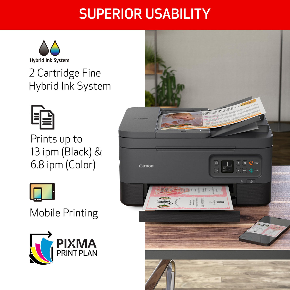 Q: Is the Canon PIXMA TR7020a compatible with mobile devices?A: Yes, the Canon PIXMA TR7020a supports mobile printing through various apps such as Canon PRINT App, Apple AirPrint, and Google Cloud Print, allowing you to print directly from your smartphone or tablet.