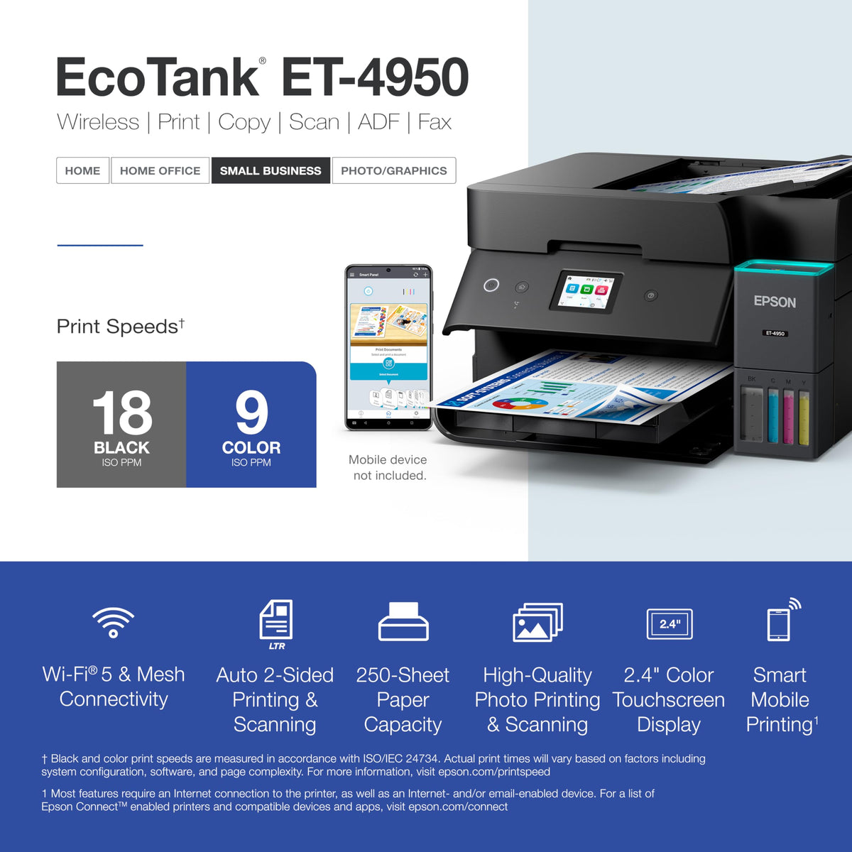 Introducing The Ecotank Et-4950-The Ultimate Home Office Printer. Say Goodbye To Expensive Cartridges With The Epson Ecotank Et-4950, The Newest Innovation From A Recognized Leader In Photographic Printing. Combining Simplicity With A Modern Design, The Et-4950 Features Advanced Technology That Enhances Both Performance And Print Quality, Making It An Ideal Choice For Productive Office Printing-Including Content Created By Ai. Powered By Precisioncore Heat-Free Technology, The Et-4950 Offers A Duty Cycle Thats Twice As Robust As Its Predecessor. And Unlike Conventional Thermal Inkjet Printers, Its Unique Permanent Printhead Is Engineered To Last The Life Of The Printer. Designed To Be Simple And Error-Free, Refilling Ink Is A Breeze With Large Ink Tanks And Uniquely Keyed Ecofit Bottles-No Mess, No Stress And No Ink Bottle Mix-Ups. And With Enough Ink In The Box To Last Up To Three Years4, Youll Enjoy Affordable, Worry-Free Color Printing Without The Hassle Of Frequently Replacing Cartridges. Featuring Ethernet And Wi-Fi For Seamless Connectivity, Along With The User-Friendly Epson Smart Panel App5, You Can Easily Print, Scan, And More Directly From Your Computer Or Wireless Mobile Device6. Choose Epson Ecotank, The Worlds #1 Selling Supertank Printer. With More Than 100 Million Units Sold Globally7 Across Seven Generations Of Innovation, Ecotank Consistently Delivers Affordable, Photo-Quality Prints, Making It A Reliable Choice For All Your Printing Needs.