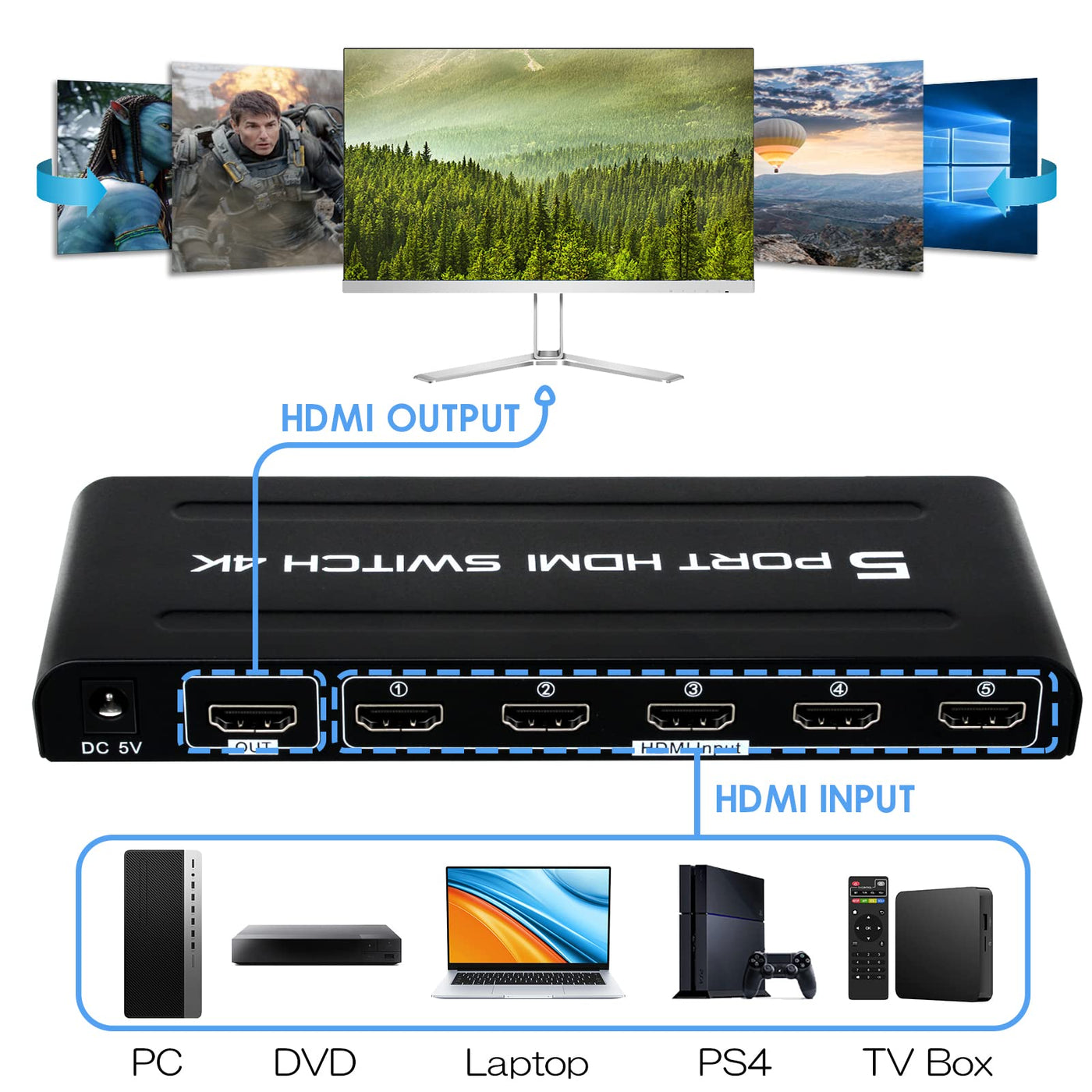 This 5 Port Hdmi Switch Selector Allows Up To 5 Hdmi Connected Input Devices(Gaming Console, Blue-Ray Player, Laptop, Stb, Xbox, Etc.) To 1 Hd Monitor/Projector/Ultra Hd Tv, Etc. Then Freely Switch Between 5 Hdmi Input Source.
