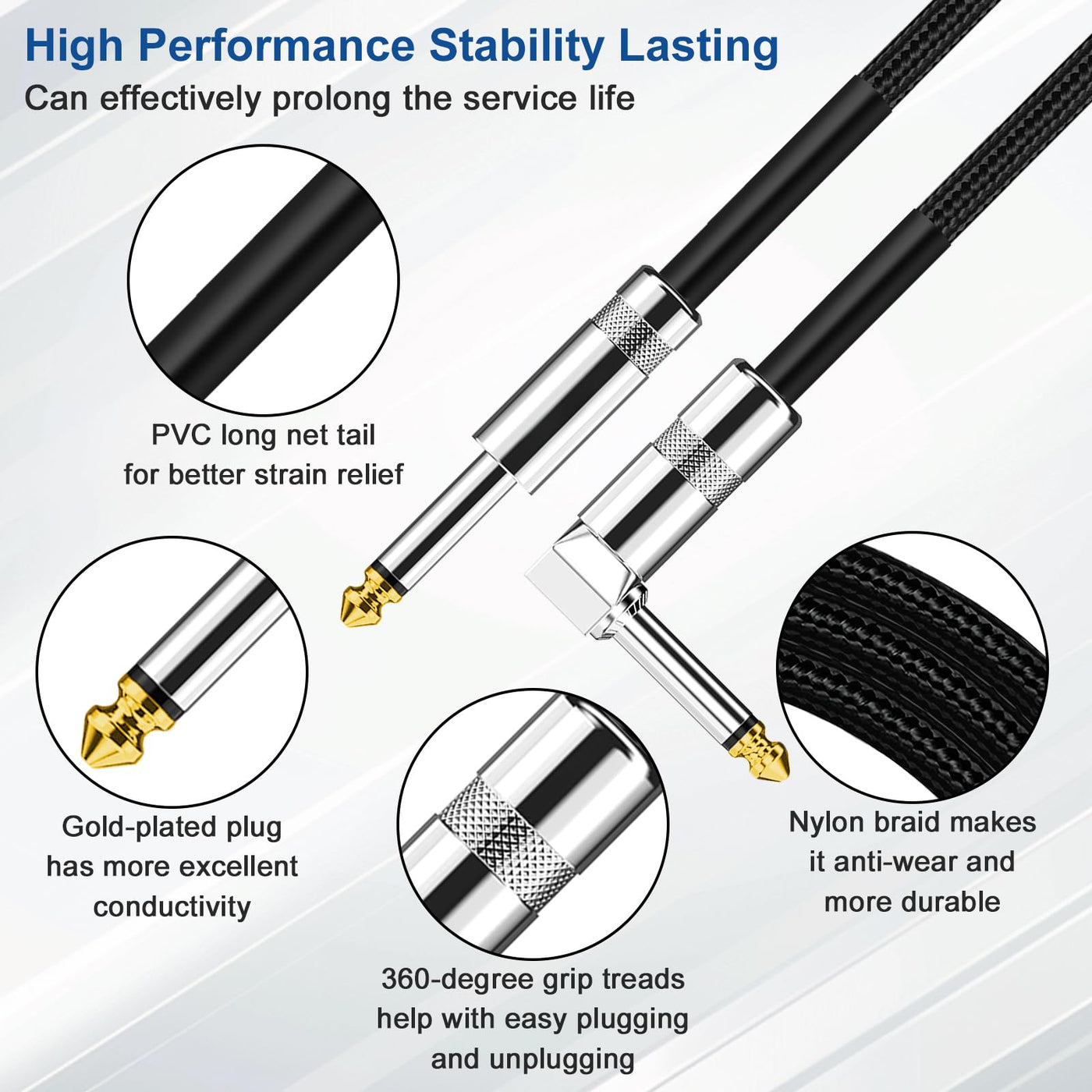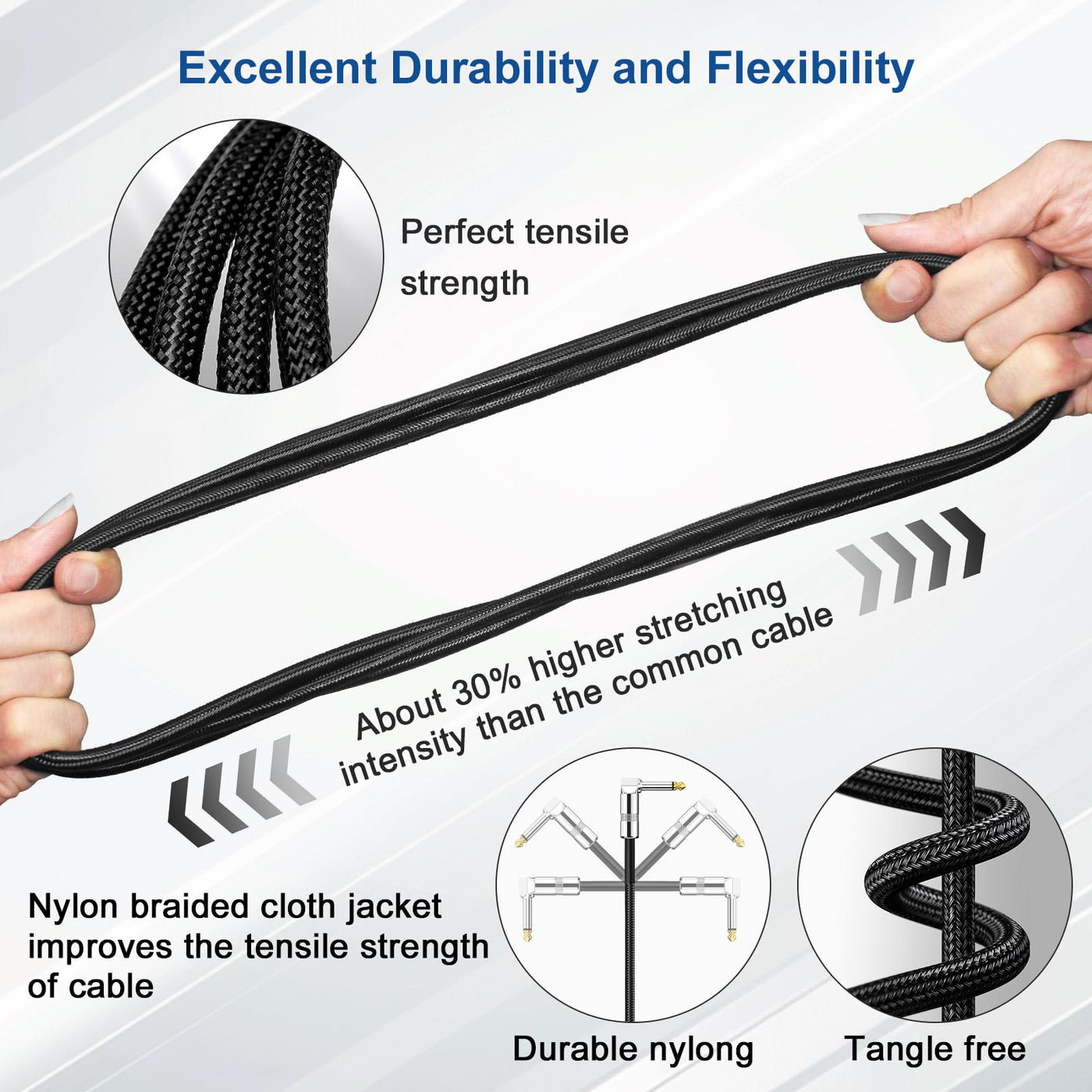 Instrument Cables That Perform Withpro Quality Sound Top Features: Aluminum Alloy Casing. With A Gold-Plated Contact. Plated, Right-Angle Trs Connector. Stylish Woven Cloth Exteriors Add Vintage Appeal While Reducing Wear And Tear On The Road. Low Noise High-Density Ofc 95% Copper Braiding And Tpe Material Insulation, Multi-Layer Shielding, And Insulation To Reduce Noise And Provide Pure Sound For Your Electric Instrument. High Fidelity Two-Layer Shielding 22 Awg Oxygen-Free Copper (Ofc) With 64 Shields Enhances Signal Transmission And Makes Music Clearer And More High Quality Triple Strain Relief System: External Rubber Heat Shrink, Internal Rubber Booty, And Metal Clamp Strain Relief Allow For Many Years Of Trouble-Free Usage. Specification: Cable Gauge: 24 Awg Cable Length: 10 Feet (3 M) Wire Specification: 2/20*0.12 Mm Oxygen-Free Copper Cord Composition: Aluminum Foil, Ofc Copper, And Environmental Pvc Triple Strain Relief System: External Rubber Heat Shrink, Internal Rubber Booty, And Metal Clamp Strain Relief Allow For Many Years Of Trouble-Free Usage. Easy To Store With A Flexible Design, Our Electronic Cable Coils Neatly For Easy Storage. The Cable Ties Keep It Safely In Place For Easy Transportation. Guitar Cables Are Unsurpassed For Connecting Electric Guitars, Basses, And Keyboards To Amps. The Tangle-Free Nylon Braided Cord With Aluminum Connector Is More Durable, More Flexible, And More Sturdy Than Other Normal Cables. You Can Never Have Other Cables! Quality Service: We Provide The Highest-Quality Products And The Best Customer Service. You'Ll Never Have To Worry About Buying Another Guitar Cable Again! If You Are Not Satisfied With The Instrument Cables, Please Feel Free To Contact Us. Package Content: 2 Pcs Guitar Cables, 10 Ft 6 Pcs Celluloid Guitar Picks