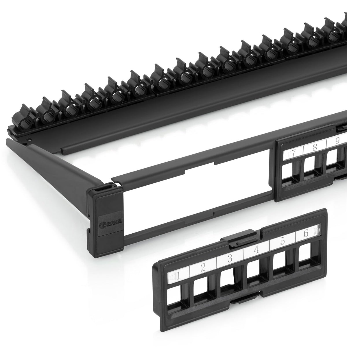 Q: How does the cable management feature work in this patch panel?A: The patch panel includes a convenient cable management unit with a removable 6-Port panel, making it easier to access and modify cables without disassembling the entire unit. Additionally, it features a strong rear cable management bar that can accommodate various wire diameters.