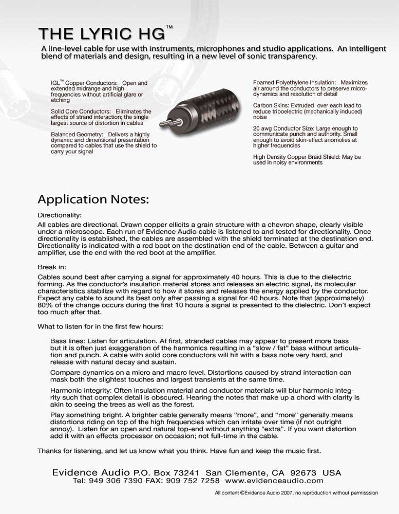 Q: What makes the Evidence Audio LYHGSS20 Lyric instrument cable unique?A: The Evidence Audio LYHGSS20 Lyric instrument cable features a special copper conductor that enhances midrange and high frequencies, allowing for dynamic sound quality. Its symmetrical design helps reduce noise and preserve signal integrity, making it ideal for professional musicians.