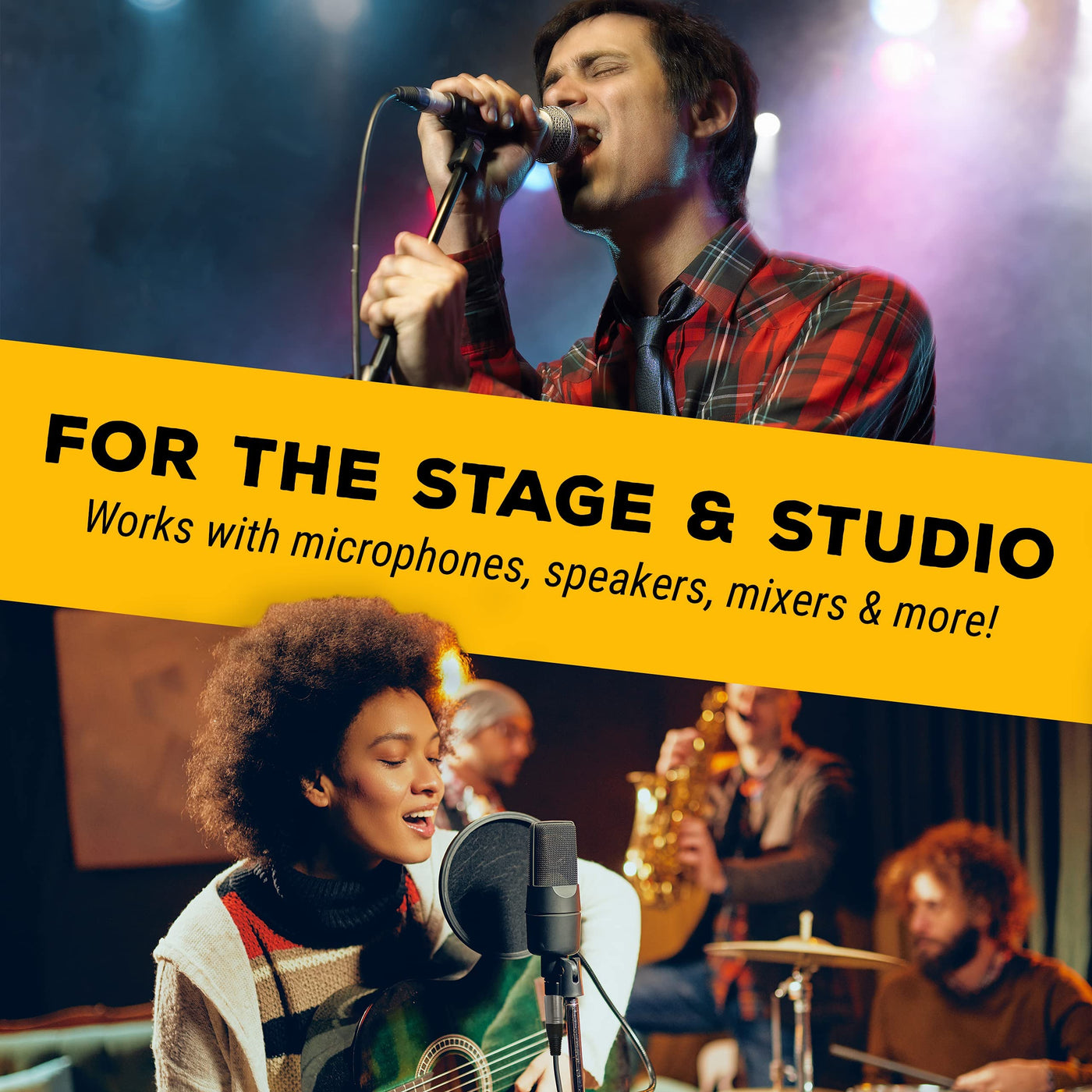 Q: Are these cables suitable for professional use?A: Yes, these cables are designed for professional use, featuring a heavy-duty, flexible rubber jacket and true balanced LO-Z shielding for noise-free performance.