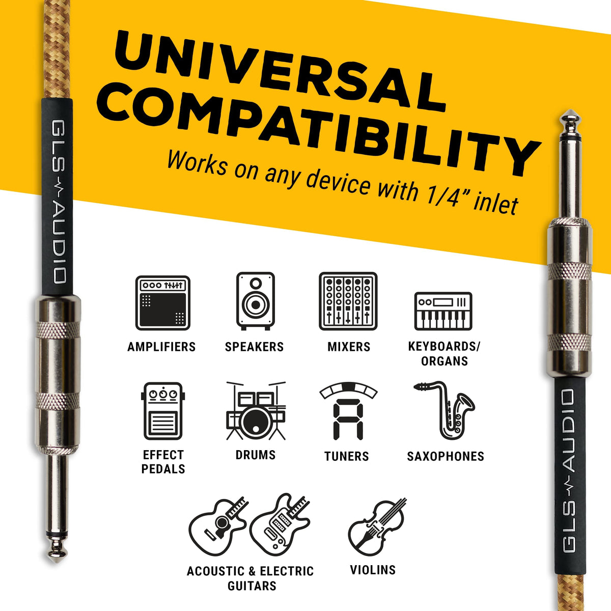 Gls Audio Instrument Cable 1/4 Inch Ts To 1/4 Inch Instrument Cable For Bass/Electric Guitar Brown/Yellow Braided Tweed, 10Ft
