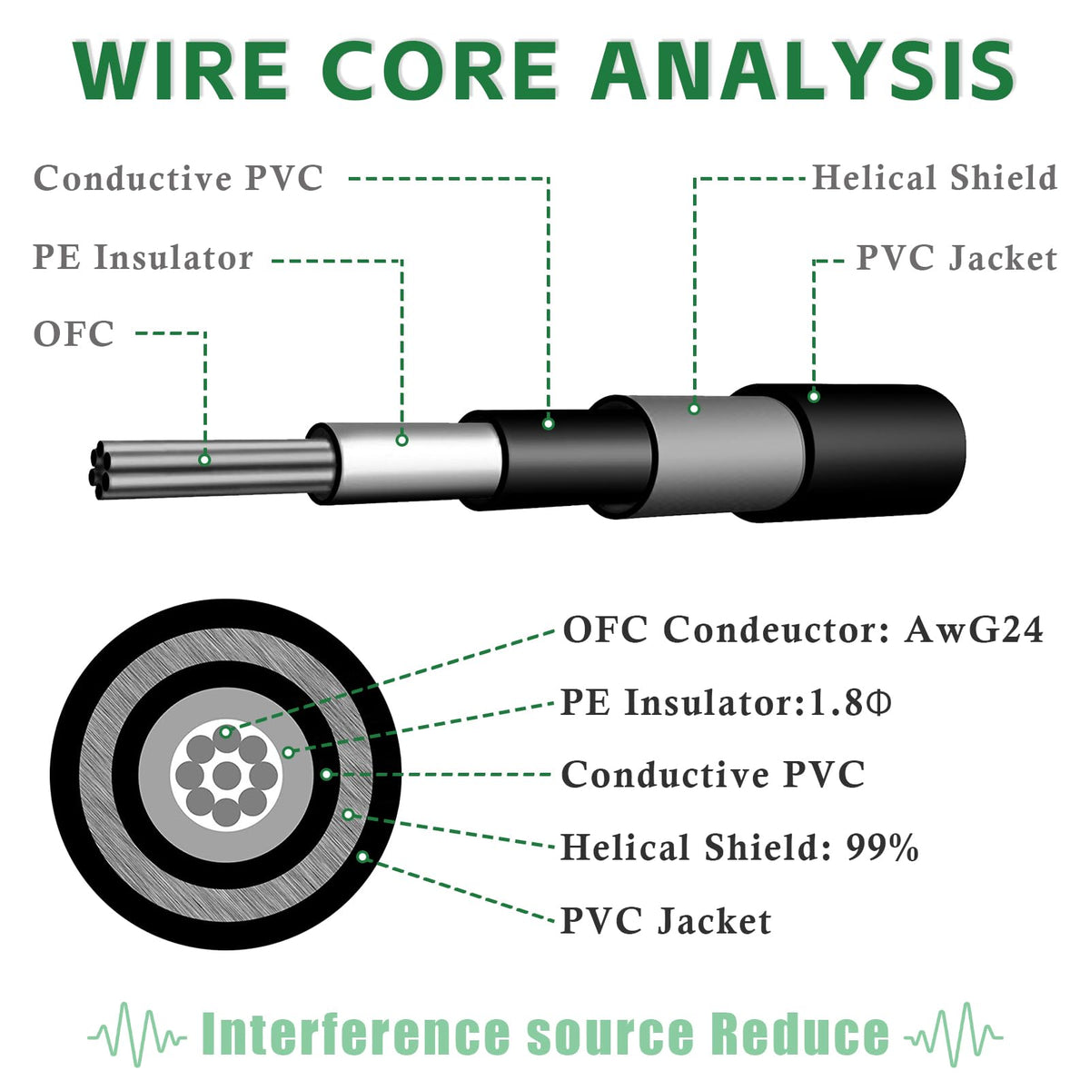 Q: What materials are used in the construction of these cables?A: The GOGHOST patch cables feature durable and low noise gold-plated connectors, along with ultra-pure, oxygen-free copper conductors that ensure low capacitance and a clear, pure tone.