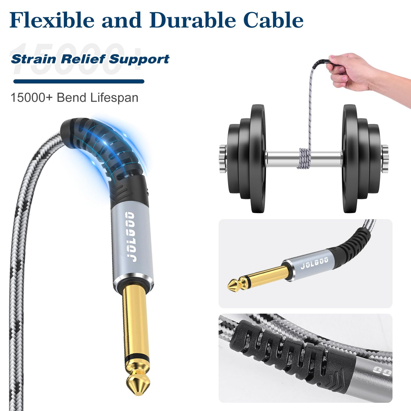 Q: What makes the JOLGOO 1/4 Inch Guitar Instrument Cable suitable for professional use?A: The JOLGOO 1/4 Inch Guitar Instrument Cable features 24k gold-plated connectors that resist corrosion and ensure a clear, optimal signal transfer with minimal signal loss. The high purity OFC core and excellent sound quality make it ideal for professional musicians.