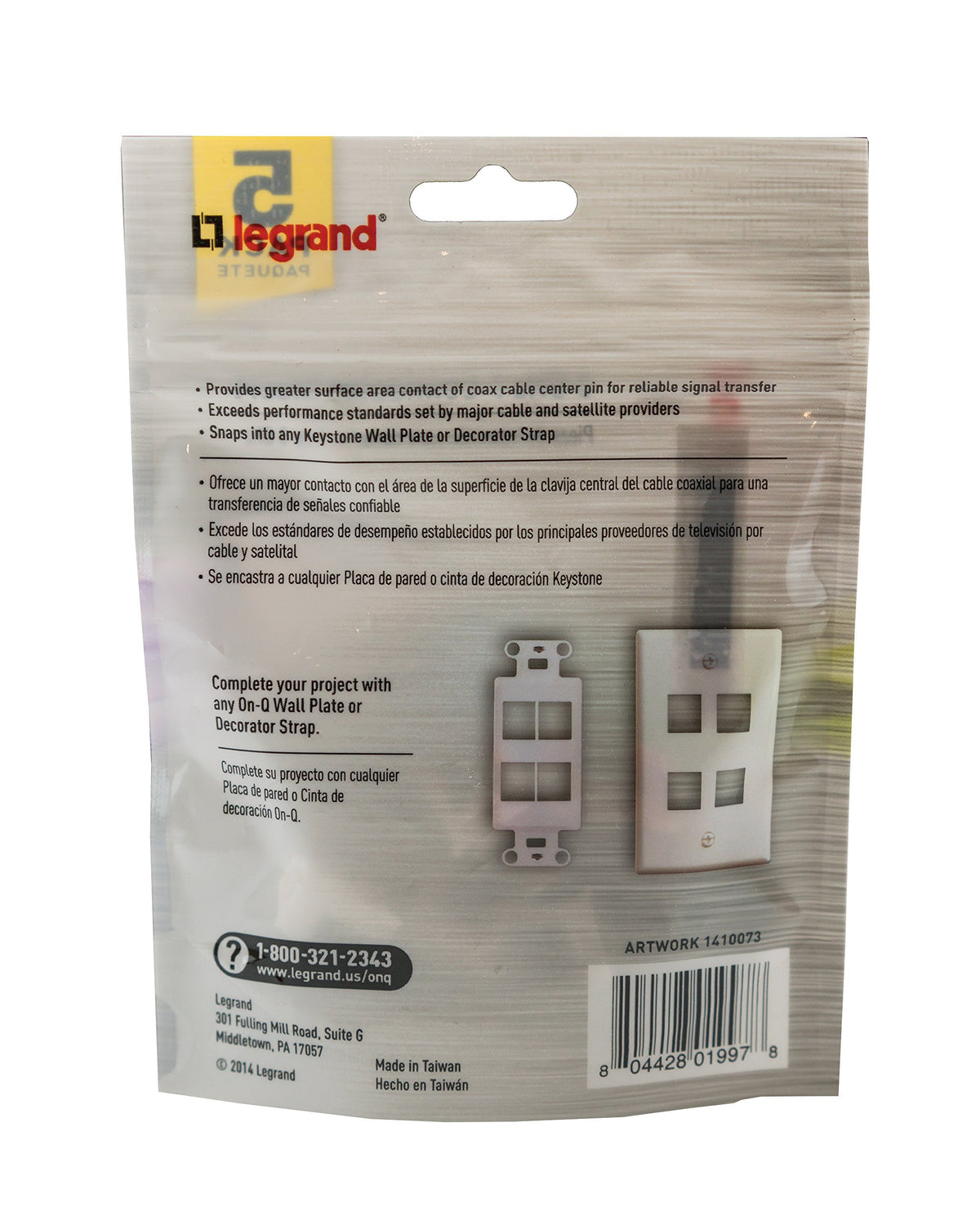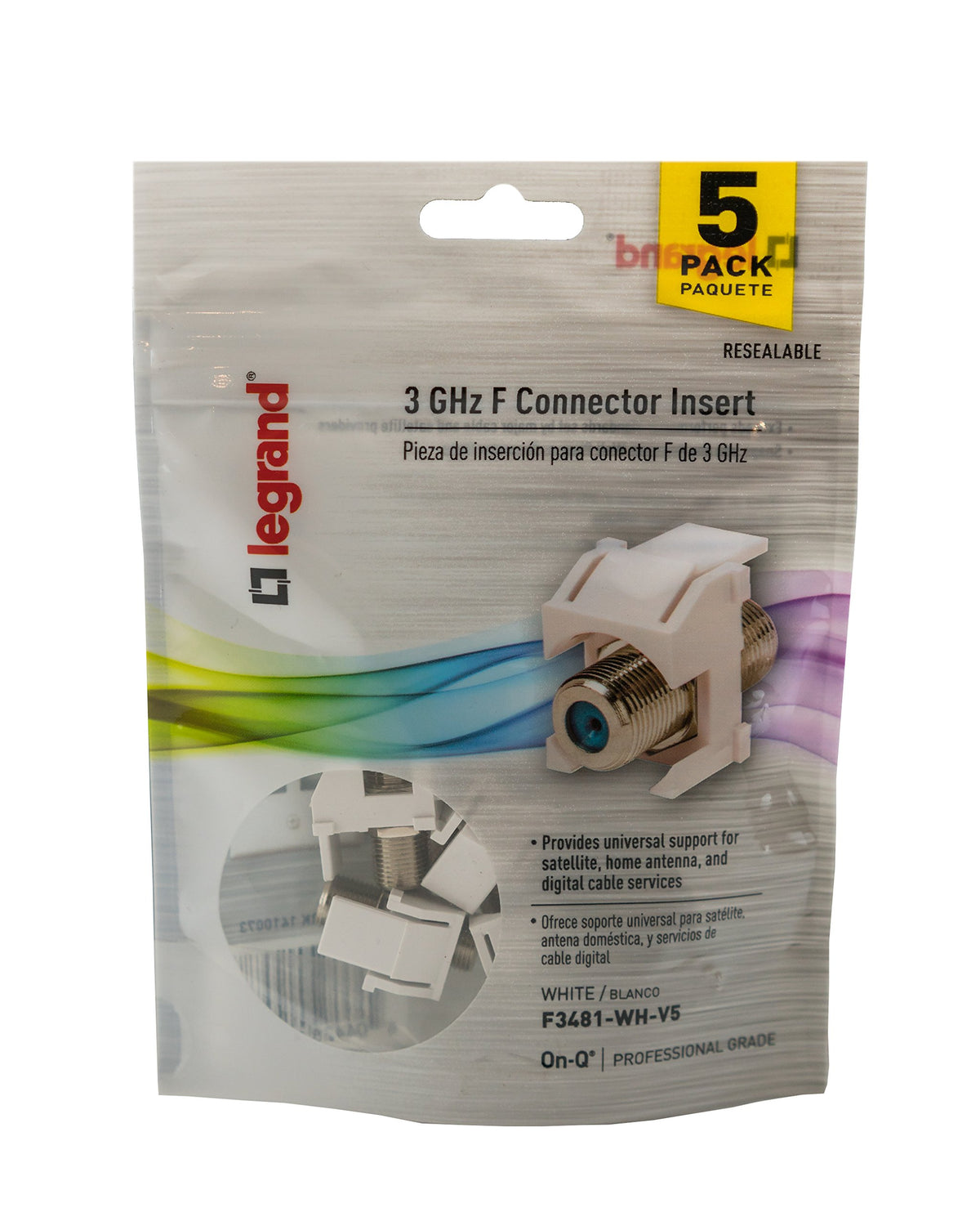 Legrand Onq Recessed Keystone Coax Insert, F Keystone Connector, 3Ghz Keystone F 81 Coupler, Nickel, White, 5 Pack, F3481Whv5