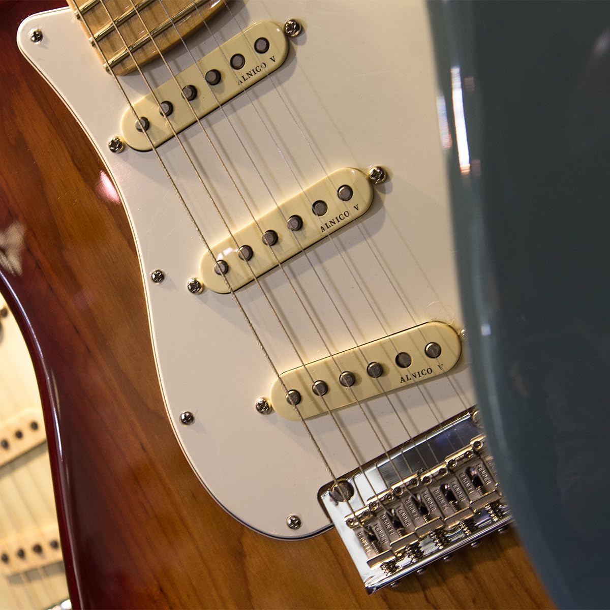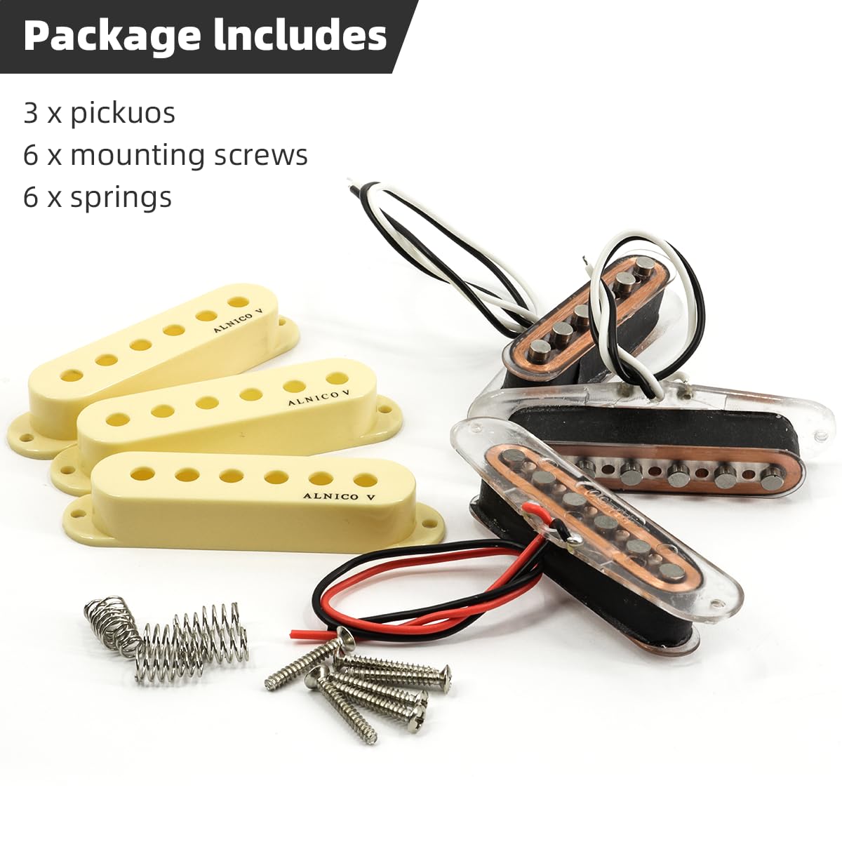 Specifications: Position: Neck/Middle/Bridge Single Coil Pickup Set Magnet: Alnico 5. Pole Pieces: Staggered. Resistance: 8.2(Neck); 9K(Middle); 9.2K(Bridge) Bobbin: Clear Plastic Plate Bobbin. Cover: Bronze Plastic Cover Package Included: 3 X Single Coil Sound Pickups 6 X Screws 6 X Springs