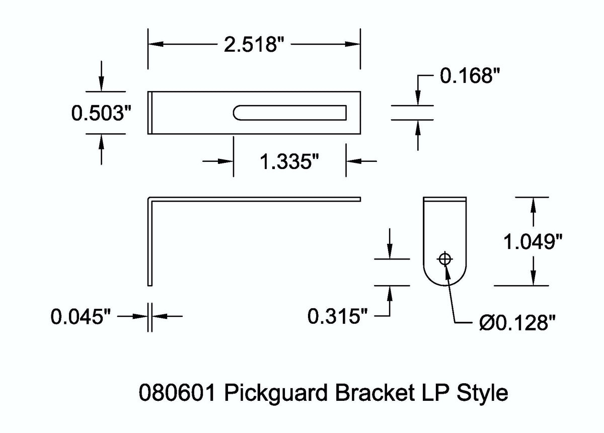 Pickguard Bracket, Lp Style Guitar, Black Finish, Electric. Specifications: Metal Bracket With Black Finish Kit Includes Bracket, Nut And Bolt And Mounting Screw Bracket Is 2 1/2 Long X 1 1/32 High It Has A Mounting Slot 1 5/16 Long Designed To Mount To The Side Of The Guitar Body And The Inside Of The Pick Guard. Bracket Angle Is 90 Degree