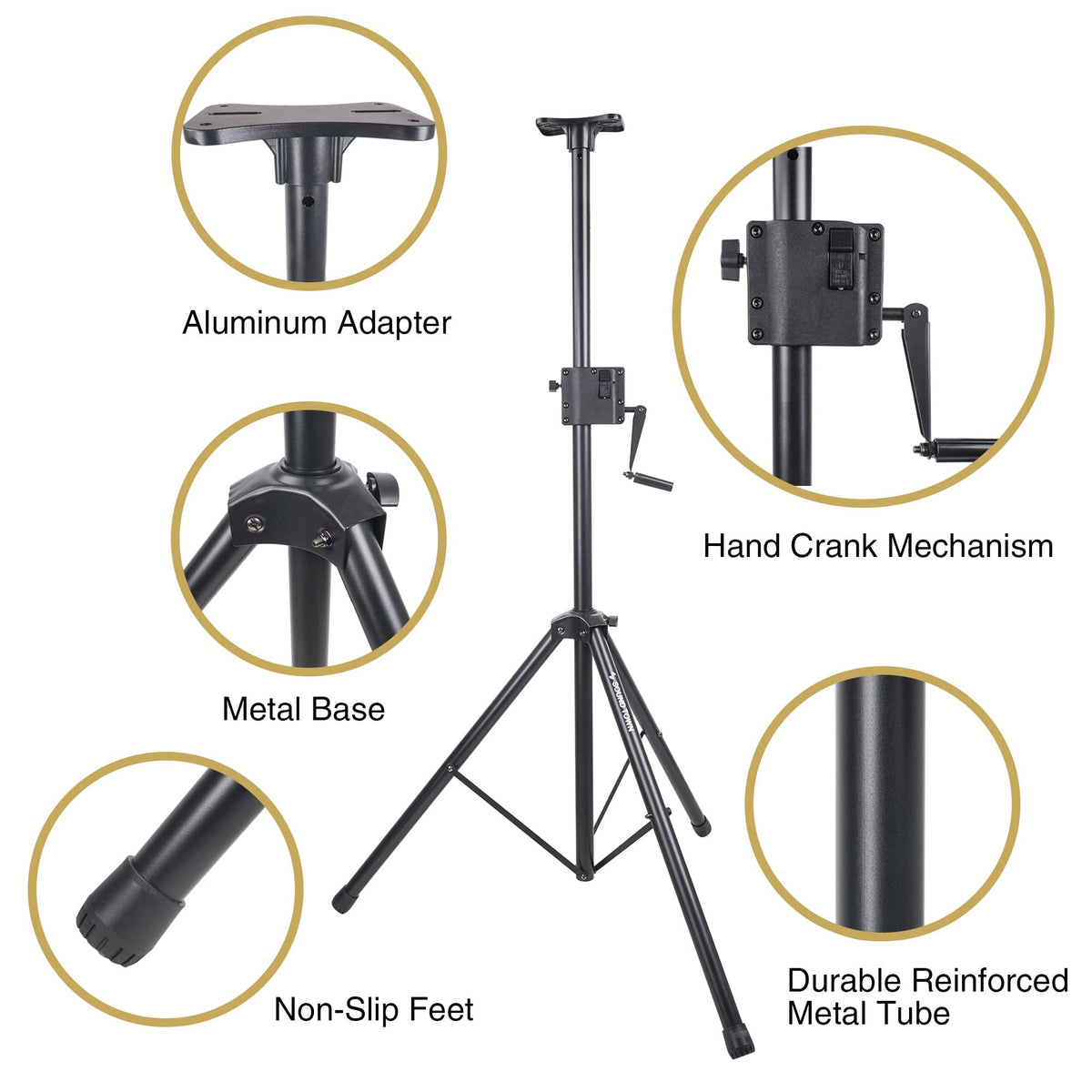 The Sound Town Stsda-78Cu-Pair Is A 2-Pack Of Tripod Speaker Stands With An Easy-To-Use Crank-Up Height Adjustment System. Each Speaker Stands Heavy-Duty Construction Holds Up To 100 Lbs. The Hand Crank Allows Height To Be Adjusted From 48 To 78. The Non-Slip Rubber Feet And Locking Screw Provide A Worry-Free Speaker Mounting Solution Thats Built To Last. Two Speaker Stand Carry Bags And Pole-Mount Adapter Brackets Are Also Included In The Package. Features Convenient Crank-Up Speaker Stands For Easy Raising And Lowering Of Your Pa Speaker Cabinets Heavy-Duty Construction, Hand Crank System And Locking Screws For Worry-Free Speaker Mounting Height Adjustable From 48 To 78 Holds Up To 100 Lbs. Per Speaker Stand Two Carry Bags And Pole-Mount Adapter Brackets Included Specifications Package Weight 29.9 Lbs. Package Dimensions 47.0 X 8.7 X 10.6 (Inches)