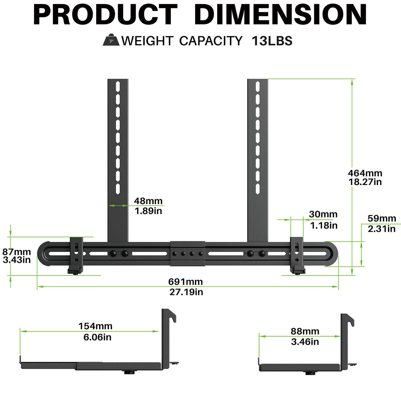 1. Compatibility: Suitable For Most Tvs Distance On Horizontal Max 600Mm And Min 150Mm&Nbsp;And Max 13 Lbs Loading Capacity. Also, Fits Most Tvs Up To 600X400Mm. 2. Flexible &Amp;&Nbsp;Extendable Holders: Sound Bar Tv Mount Adjustable Base Holder Extends To 6.06'' And Retracts Back To 3.46'', Suitable For Sound Bars In Different Widths. 3. Works With Most Tv Mount: Soundbar Tv Wall Mount Is Compatible With Most Fixed, Tilt, Full Motion Tv Mount Or Tv Stand, And The Soundbar Bracket Allows The Sound Bar To Move With The Tv. 4. Package Includes: 1X Soundbar Mount, Most Necessary Mounting Hardwares, 1X User Instruction.
