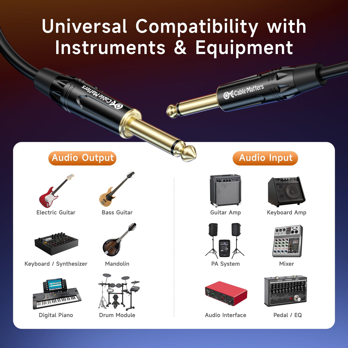 Connect More With Cable Matters Audio Products Plug &Amp; Play Instrument Cable In A Cost-Effective 2-Pack The Cable Matters 1/4 Inch Ts Straight Instrument Cable Connects A Guitar And Other Instrument To An Amplifier, Mixing Console Or Pedal Board. Superior Construction With A Lifetime Warranty The Combination Of Gold-Plated Connector Tips, Bare Oxygen-Free Copper Conductors With Polyethylene Insulation, And Foil &Amp; Braid Shielding Combine Together To Provide Noise-Free And Precise Signal Transmission. The Pvc Cable Jacket Is Durable But Flexible For Easy Installations And Long Life. A Lifetime Warranty Is Included With This Instrument Cable For Peace Of Mind When Purchasing. Cable Specifications - Connector 1: 1/4 Inch Ts Straight Male - Connector 1: 1/4 Inch Ts Straight Male - Cable Conductor: Oxygen-Free Bare Copper - Connector Contacts: Gold-Plated - Shielding: Foil &Amp; Braid - Jacket Material: Pvc - Wire Gauge: 20 Awg - Cable Jacket Outside Diameter: 5.8Mm Package Contents 2 X 1/4 Inch Ts Cables Warranty Limited Lifetime Warranty And Product Support
