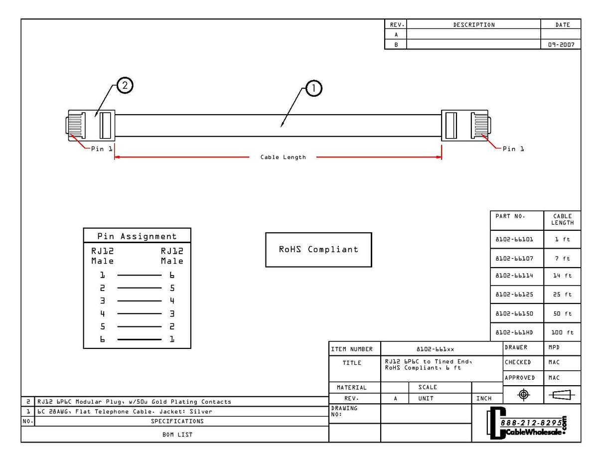 This 14 foot Silver Satin RJ12 Telephone cable is used to connect your phone to your wall. It is the flat variety and has 6 pins on the RJ12 plugs and features 6 conductors. The cable is reversed for voice applications.