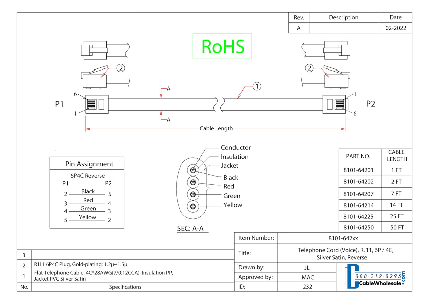 This 50 Foot Silver Satin Rj11 Telephone Cable Is Used To Connect Your Phone To Your Wall. It Is The Flat Variety And Has 6 Pins On The Rj11 Plugs And Features 4 Conductors. The Cable Is Reversed For Voice Applications.