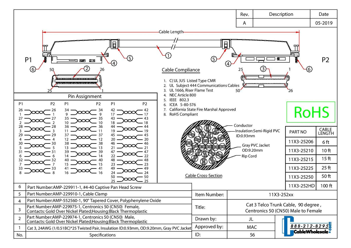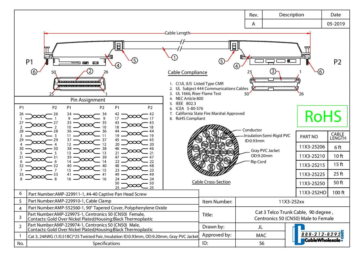 Our 6 Foot Cat3 Telco Trunk Cable Features Two 90 Degree Amphenol Connectors (Male To Female) And 25 Twisted Pairs. Use These Cables To Bridge Telephone Based Switch Boards And Equipment Require A Centronics 50 (Cn50) Type Amphenol Connector. 25 Twisted Pair Cables Are Typically Used With 66 Type Blocks In Telephone (Distribution And Routing) Applications.