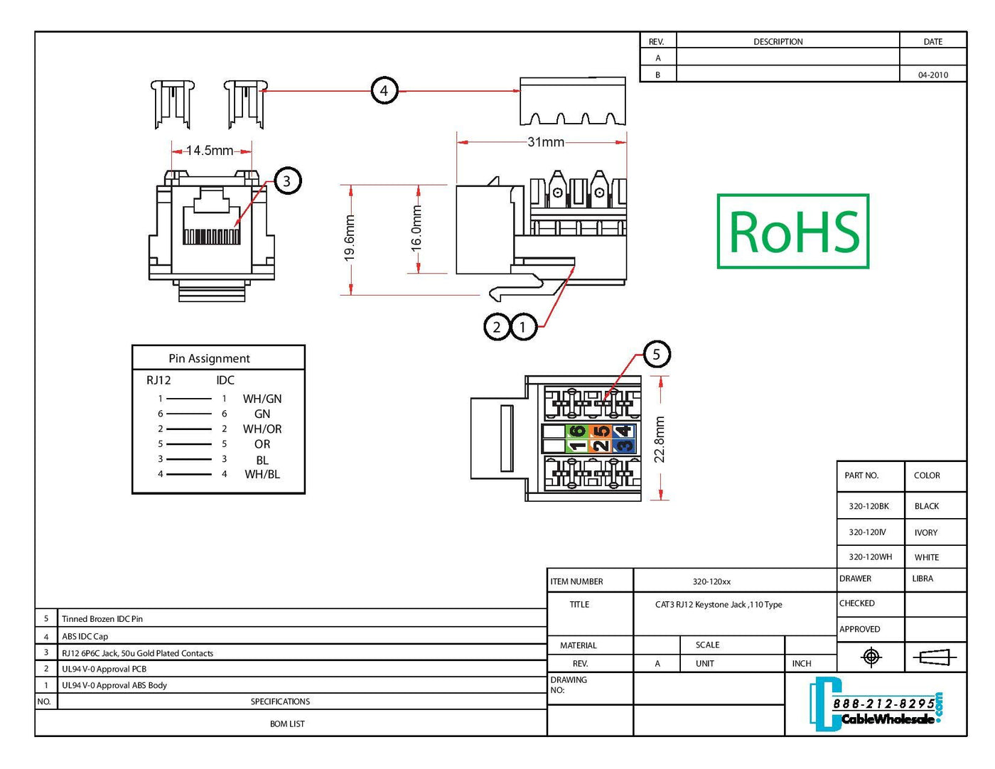 Cablewholesale Rj12 Keystone Insert, White, Phone/Data Jack, Rj11/Rj12 Female To 110 Type Punch Down, Rj11/Rj12 Keystone Phone J