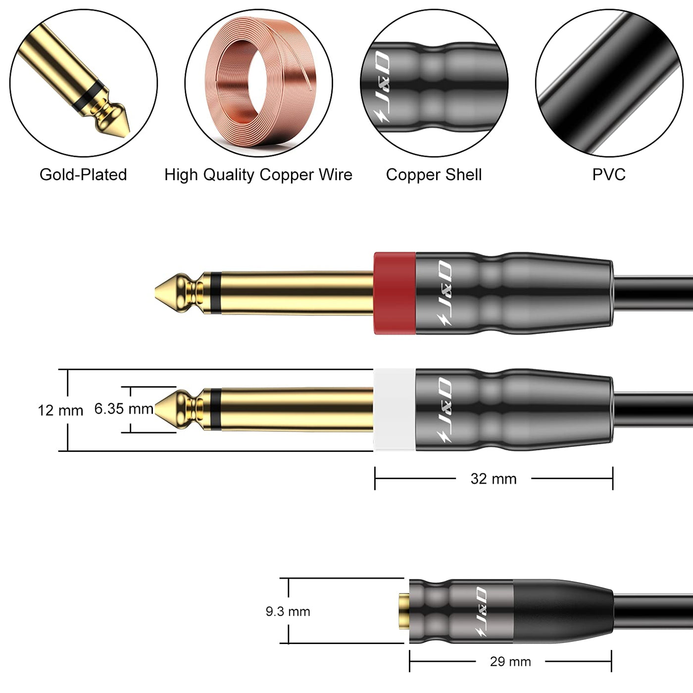 Description Heavy Duty 3.5Mm 1/8 Inch Female To 2 X 6.35Mm 1/4 Inch Male Cable.Connecting Your Smartphone, Laptop Or Pc With A 3.5Mm Jack Output To A Device With 2 X 6.35Mm Jack Inputs Such As Speakers, Mixing Desk And So On.Excellent Sound Signal Transmission With Minimal Signal Loss.Gold Plated Copper Shell, Corrosion Resistance And Durable.Warranty: J&D 1-Year Limited Warranty.