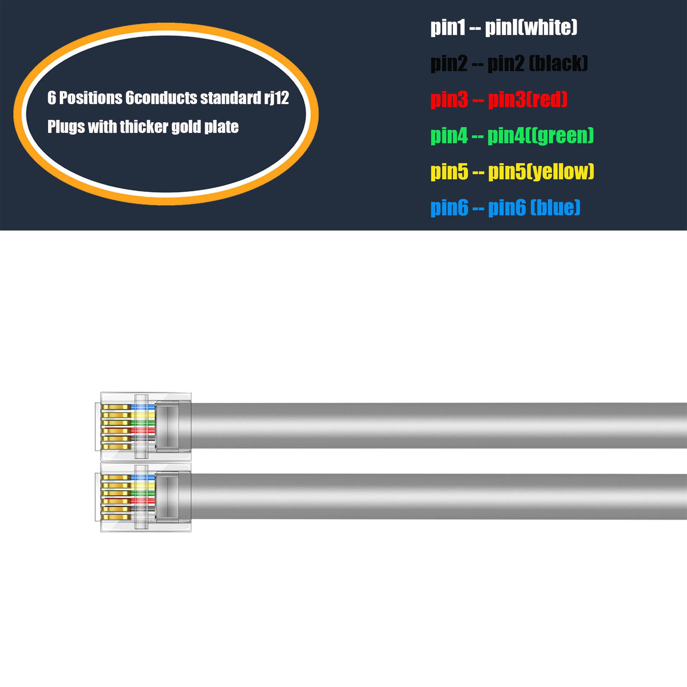 Product Description: This Is A Short Rj12 Data Cable ( Also Called Rj11 6P6C Cable ) For Both Data And Voice Use, With A 6P6C Modular Connector Each End, Product Description:If You Have Any Other Purposes Buying This, Please Make Sure That You'Re Clear About Its Wiring Diagram: 1-2-3-4-5-6 Pin To 1-2-3-4-5-6 Pin Our 6 Conductor Rj12 Telephone Line Cable Is Designed For Use With Both Business And Home Telephone Systems. These Heavy Duty Cables Will Work With 1, 2 Or 3 Line Phones. Plug And Play Ready For Fax Lines, Modems, Cordless Or Standard Phones. Pin1 -- Pin1(White) Pin2 -- Pin2 (Black) Pin3 -- Pin3 (Red) Pin4 -- Pin4 (Green) Pin5 -- Pin5 (Yellow) Pin6 -- Pin6 (Blue) Material: Copper Wires Jacket Material: Pvc, Black/White/Silver Cable Length: 6.6/10/15Feet Easy To Install And Reliable Connection 3 Pcs In The Package Attention: Warranty:Offers 30 Days Money-Back And 1 Year Replacement Service