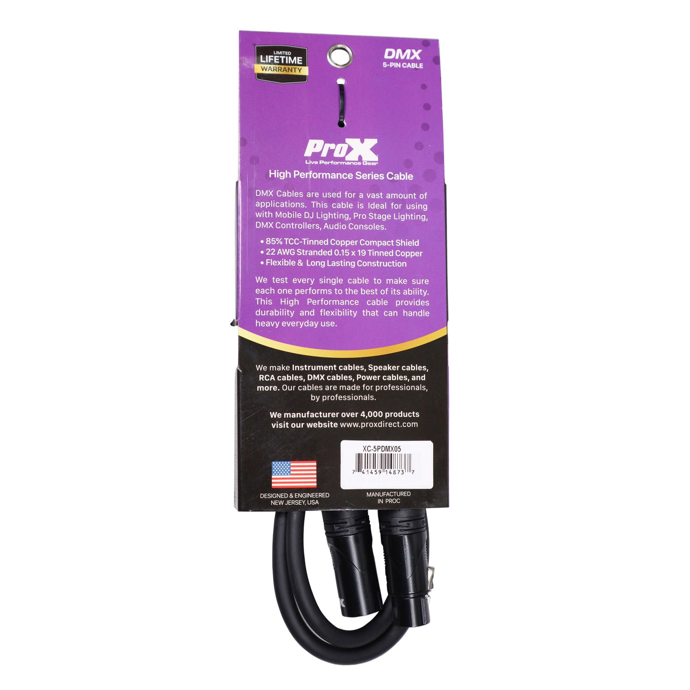 The Prox Xc-5Pdmx05Cable Is Ideal For Dmx Connection Applications Where A Device With A Male Dmx Xlr-5 Output/Input Needs To Be Connected To A Device With A Female Dmx Xlr-5 Output/Input. 22Awg Oxygen-Free Copper (Ofc) Conductors For Maximum Signal Transfer.Prox Cables Are Built With Uncompromised Quality With Excellent Performance At Each Connection - Instrument Cables, Speaker Cables, Rca Cables, Dmx Cables, Power Cables And More. Our Cables Are Made For Professionals, By Professionals.Bending &Twisting, Are No Match For Our High-Performance Tour-Grade Dmx Cables. They'Re Designed To Provide Years Of Dependable Service And Outlast Every Other Cable On The Market! Complete Coil Technology Demands Consistent Weave Tolerances To Create Precise And Accurate Data Transmission. This Is The Most Important Part Of The Design And Greatly Affects Performance.Note: Twisted Pair Dmx Data Transmission Cables Are Not Suitable For Audio Use. Conversely, Audio Cables Are Not Suitable For Dmx Data Use. Their Specifications And Characteristics Differ Substantially. Always Use The Correct Cable For Reliable Connections!Technical Specificationspolyethylene Insulationdual Twisted Pair Data Cable (4 Conductors)Polyethylene Inner Jacketduofoil (100% Coverage)Cotton Plus A Tinned Copper Braid Shield (85% Coverage)Pvc Jacket For Durabilitynominal Characteristic Impedance: 110 Ohmsnominal Capacitance Conductor To Conductor @ 1Khz: 12.8 Pf/Ftnominal Cap Cond. To Other Cond. & Shield @ 1Kh Z: 23 Pf/Ftnominal Velocity Of Propagation: 66%Nominal Delay: 1.6 Nanoseconds Per Footnominal Conductor Dc Resistance @ 20 Degrees C: 24 Ohms/1000 Ftnominal Outer Shield Dc Resistance @ 20 Degrees C: 3.4 Ohms/ 1000 Ftnominal Attenuation (Db/100 Ft): 0.6 (@ 1 Mh Z) Db/100 Ftmaximum Recommended Current: 2.1 Amps Per Conductor @ 25 Degrees Coperating Temperature Range: (-30 Degrees C To + 75 Degrees C)
