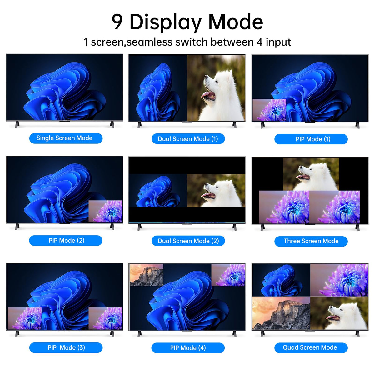 4K Hdmi Quad Multi Viewer 4X1, Yinker 4 In 1 Out Hdmi Quad Switcher 1 To 4 Screen Multiviewer For 4K@60Hz, Supports Audio Extractor & Screen Rotation & 8 Display Modes Pip Pbp & Ir Remote & Rs232
