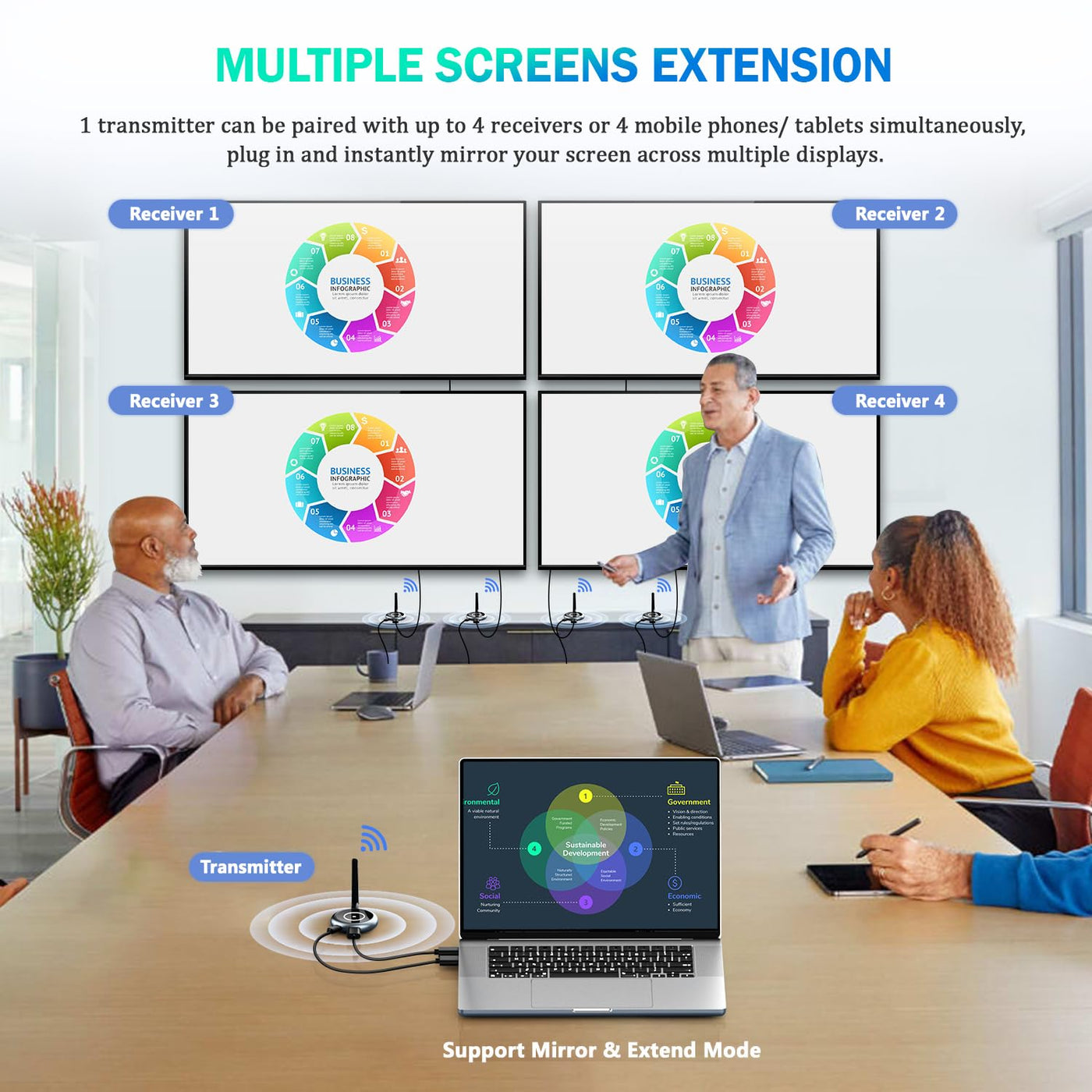 Aimibo Wireless Hdmi Transmitter And Receiver Allows You To Wirelessly Stream Your Hdmi Output Device To Multiple Displays, Making It Perfect For Conference Rooms, Classrooms, And Home Entertainment Setups. Features: Plug-And-Play Design, User-Friendly For Everyone. 1080P@60Hz, 0.1S Delay For A Seamless Viewing Experience. Supports Up To 4 Receivers, Ideal For Multiple Displays Without Cables. Support Hdmi Transmitter Alone For Hdmi Output Device Directly To Phone/Tablet. Dual Antenna And Adjustable Wireless Channel For Stronger And More Stable Signal Transmission. 165Ft Long Range Transmission Wide Compatibility With Most Hdmi Display Devices And Video Apps. Specification: Transmission Range: Up To 165Ft/50M In An Open Environment. Video Resolution: 1080P@60Hz. Wireless Frequency: 5Ghz. Input/Output: Hdmi. Support Receiver Quantity: 4 Max. Support Touchscreen Quantity: 4 Max. Compatibility: Hdtv, Projector, Monitor, Laptop, Pc, Camera, Set-Top Boxes, Cable Box, Blu-Ray/Dvd Players, Ro-Ku, Satellite Boxes, Gaming Consoles, And More. What'S In The Box: Aimibo Wireless Hdmi Transmitter X1. Aimibo Wireless Hdmi Receiver X1. Hdmi Cable X2. Usb C Cablex2. Mini / Micro Hdmi Adapter X2. User Manual X1. Aimibo Offers You A 12-Month Manufacturer Replacement Warranty And Free Lifetime Technical Support. We Will Reply To Your Message In 24 Hours.