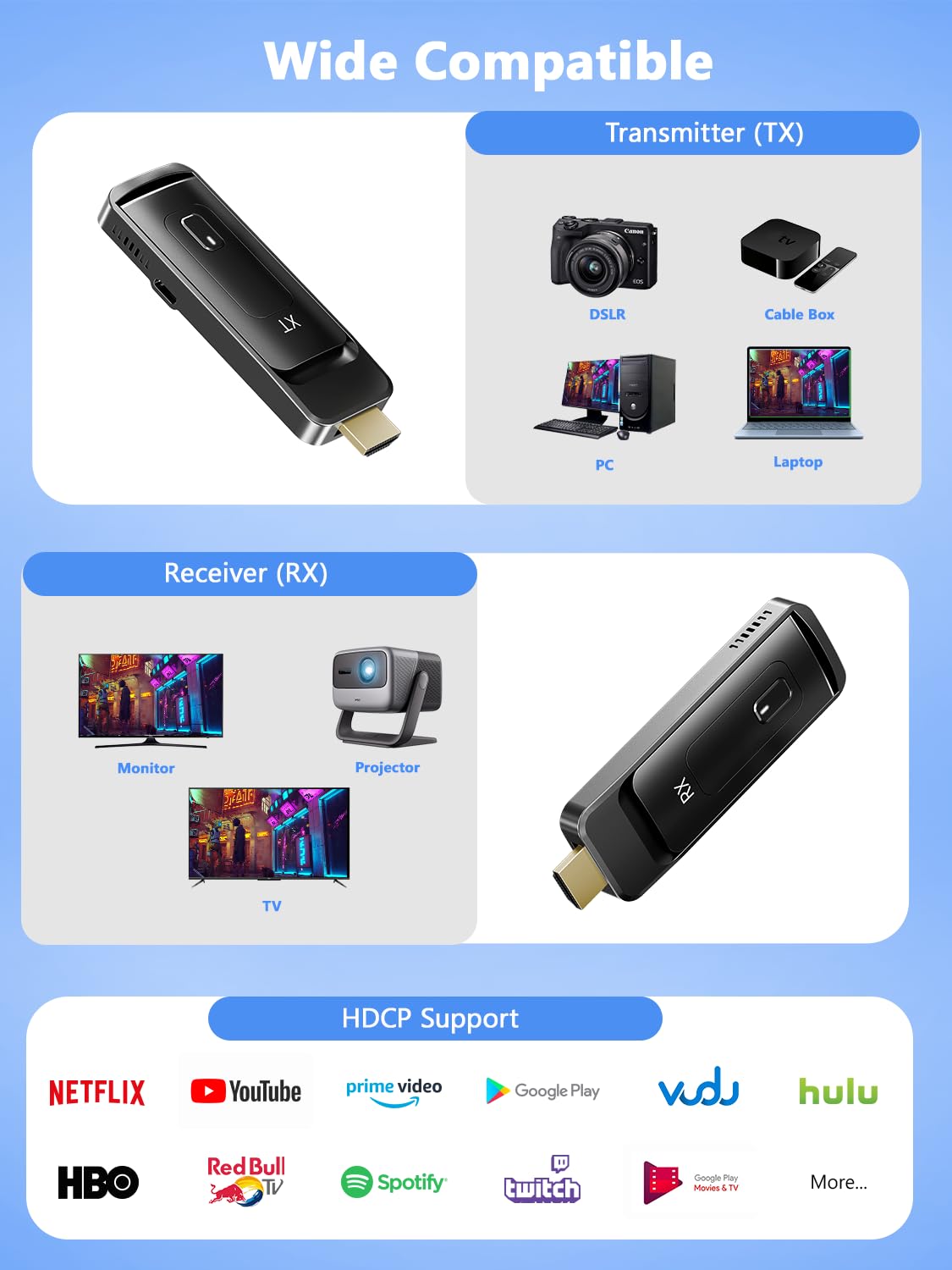 Wireless Video And Audio Transmission. Aimibo Wireless Hdmi Transmitter And Receiver Enable Seamless Streaming Of 1080P Hd Video And Audio From Laptops, Macs, Surveillance Cameras, Or Fire Tv Boxes To Large Screens Such As Monitors, Tvs, Or Projectors. Enjoy The Convenience Of Wirelessly Connecting Your Devices To Big Screens For An Immersive Viewing Experience.