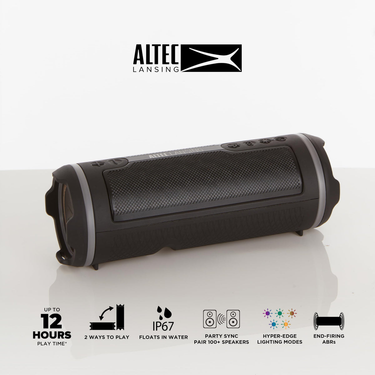 Q: What makes the Altec Lansing HydraMOTION speaker suitable for outdoor use?A: The Altec Lansing HydraMOTION speaker is designed with an IP67 waterproof rating, making it resistant to water, sand, and snow. Its rugged, adventure-ready design means you can take it hiking, biking, or on water sports without worrying about damage from the elements.