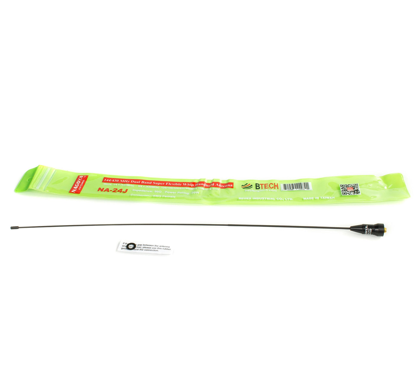 The Na-24J Is A Brand New Antenna From Nagoya. It Is Based On The Na-771, But With Improvements In Build, Material, And Performance. Most Notably The New Alloy Whip That Is Vastly Improved For Flexibility And Durability. (Along With An Improved Base Fit). Swr Is Improved On Uhf Compared To The Original Na-771 This Is A Nagoya Na-24J Dual Band High Gain Antenna For Vhf/Uhf Frequencies. It Is 1/4 Wave At 144Mhz And 5/8 Wave At 430Mhz. This Antenna Is Slightly Longer Than 16 Inches Long. The Main Improvements Are To The Brass Connector (A Better Conductor), And The New Flexible Alloy Antenna. Specifications: Frequency: 144/430Mhz Gain: 2.3Dbi Max Power: 20 Watts Vswr : Less 1.45:1 Impedance: 50 Ohm Connector: Sma-F Length: 42 Cm (~16.3 Inches) Impedance : 50 Ohms Rohs Compliant Package: 1X Nagoya Na-24J Ultra Whip Antenna 1X Rubber Spacer Compatible With: Btech: Gmrs-V1 (Na-701C Ideal For Gmrs), Murs-V1 (Na-701C Ideal For Murs) - The Na-320A Antenna Is Recommended For The Uv-5X3 Baofeng: Bf-F8Hp, Uv-82Hp, Uv-82C, Uv-82 Series, Uv-5R (All Models), And All Others And Any Other Radio That Uses The Sma-Female Connection