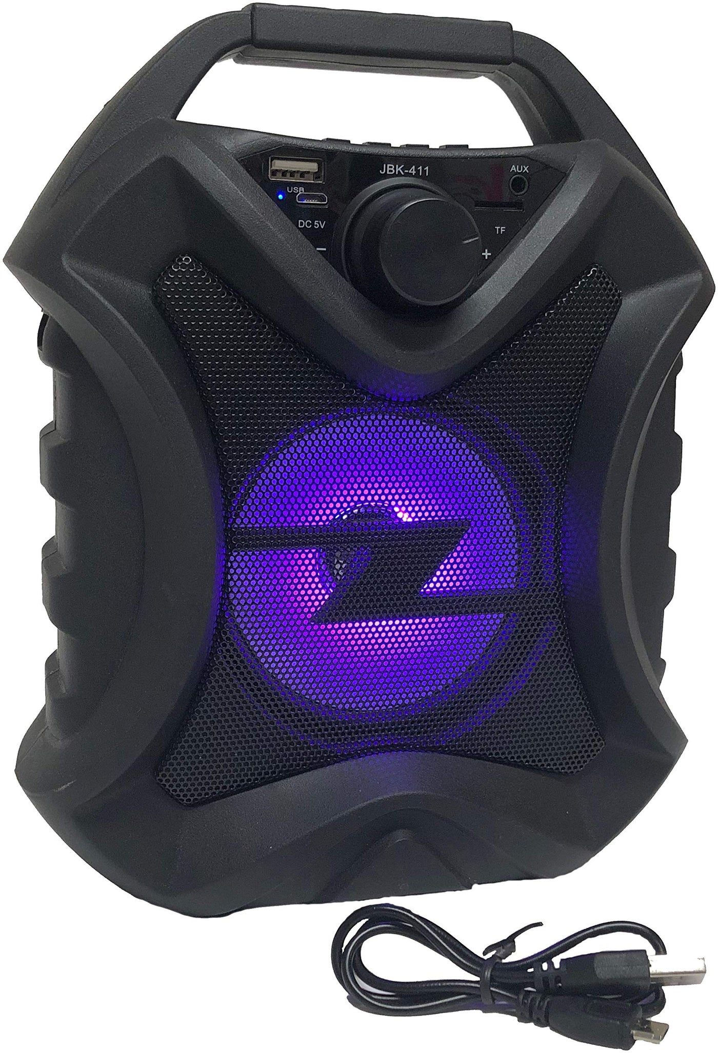Description: Bass Rockers Jbk-411 Tf/Usb Mp3 Player Bluetooth Portable Hi-Fi Speaker Product Information Output Power: 5W Speaker Size: 4'' Product Size: 240*90*160Mm Accessories: Usb/Audio Cable Product Color: Black Control: Volume Input:Aux/Usb/Tf/Bluetooth Signal To Noise Ratio: >80Db Bluetooth Version: V4.0 Operation Range: Up To 10 Meters Built-In Battery, Battery:1200Mah With Microphone Input Jack Recharge Time: 3 Hours Full Charge Playing Time: 6 Hours Seven Colors Led Light