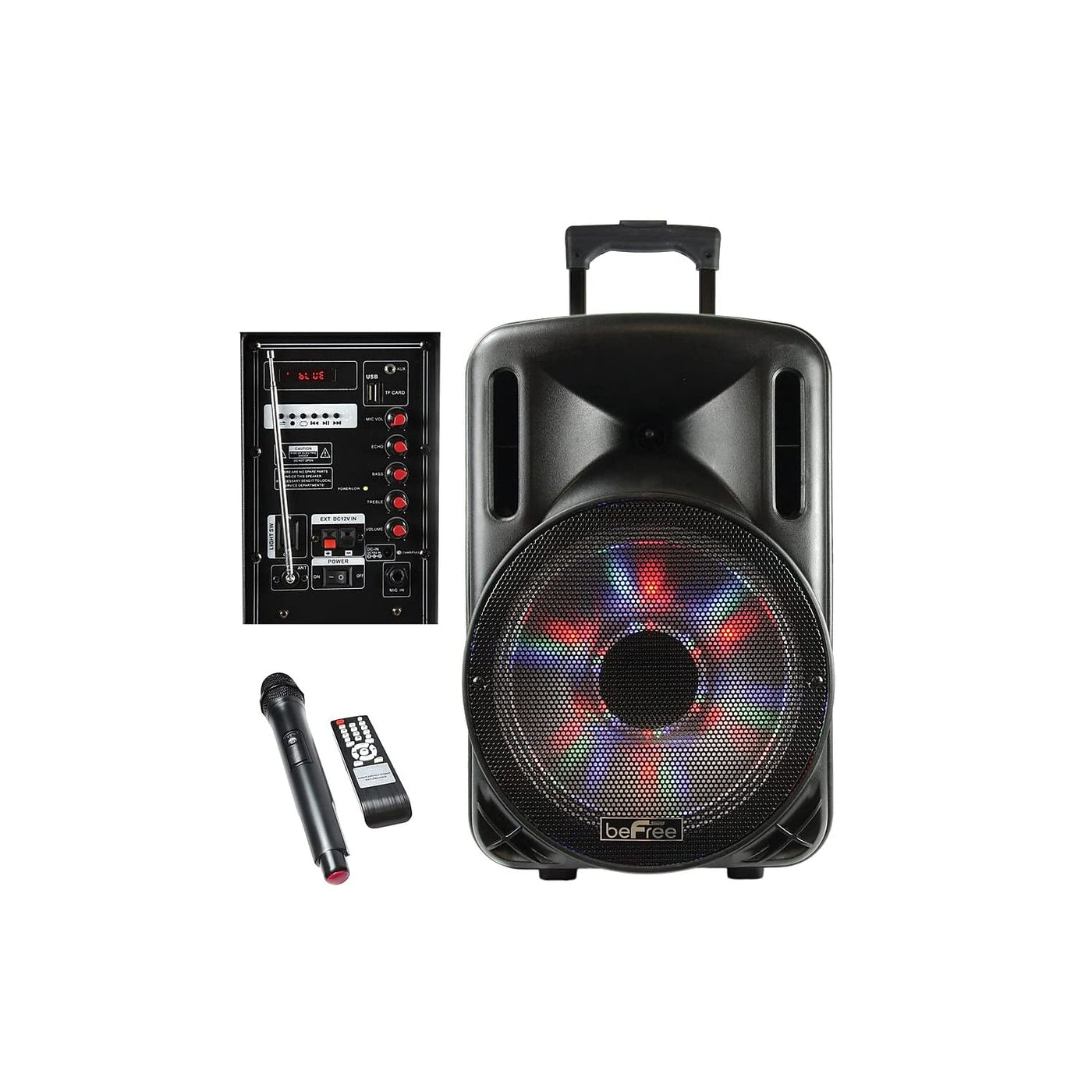 This Befree Sound Multipurpose Bluetooth Portable Pa Speaker Is Designed With 2500 Watts Power P. M. P. O , Bringing More Power And Sound To Your Party Or Event. * Usb And Microsd Car Reader* Metal Grill Covered Speakers* 12'' Woofer* Inputs: Microphone Connector, Aux-In* 12V Rechargeable Battery* Battery Life On Half Volume Approximately 6-8 Hours* Ac Ul Adapter 100-240V* Handel Bars And Wheels* Illuminating Lights* Karaoke Function* Play, Pause, Rewind, Fast Forward, Shuffle, Repeat And Record Features Also Located On Back Of Speaker* Includes Wireless Microphone And Remoter Control* One Lithium Battery- 2200Mah*3* Rack Mountableincludes * One Remote Control* One Lithium Battery- 2200Mah*3* One Wireless Microphone.