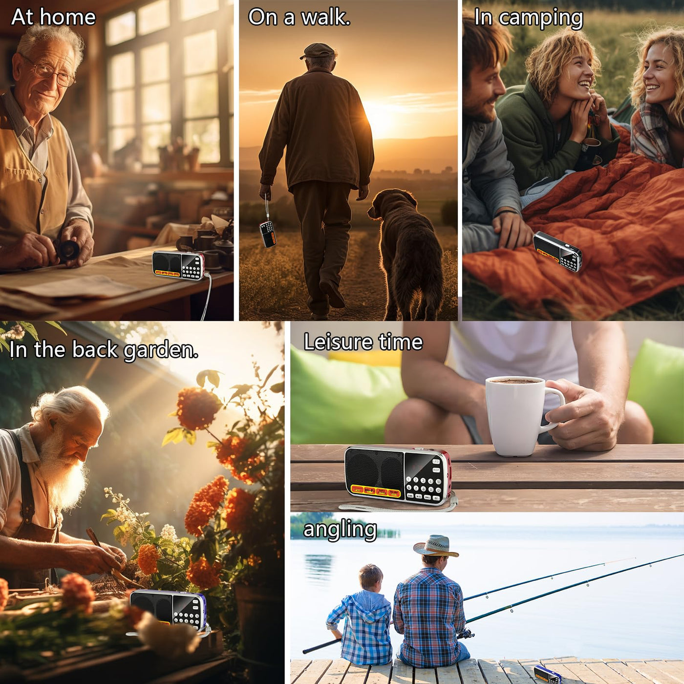 1.Am Fm Radio:Support Fm : 87.5-108Mhz / Am : 522-1710Khz, Receive More Stations Anytime And Anywhere. 2.Pocket Portable Design:This Is A Small Radio, Only The Size Of A Cell Phone, Compact And Lightweight, Easy To Put In Your Pocket, You Can Take It With You To Do Anything. 3.Large-Capacity Rechargeable Battery:1200Ma High-Capacity Lithium-Ion Battery: Tested, It Can Last More Than 10 Hours At 3/1 Volume Level. 4.Excellent Sound Quality:This Radio Adopts 3W Speakers + Bass Diaphragm; It Can Make The Sound Clearer And More Three-Dimensional, Which Makes You Feel Like You Are In The Scene. 5.Equipped With An Emergency Flashlight: When You Need To Light Up At Night Or During A Power Outage, I Believe It Can Help You At The Critical Moment. 6.Mp3 Player:This Radio Not Only Receives Radio Stations, But Also Can Play Mp3 Inside Usb Flash Memory Or Micro-Sd Card, To Meet Your Diversified Listening Needs. 7.Auto Search:Just Long Press The Scanning Button For 3 Seconds, The Radio Will Automatically Search And Save The Radio Stations, Which Is Very Convenient And Efficient. Of Course, You Can Also Directly Input The Desired Frequency. 8.Hidden Antenna:Hand Strap Antenna Design, The Antenna Is Designed Together With The Hand Strap, Which Is A Smart Design On The Radio Industry. It Not Only Won'T Weaken The Signal, But Also More Beautiful.