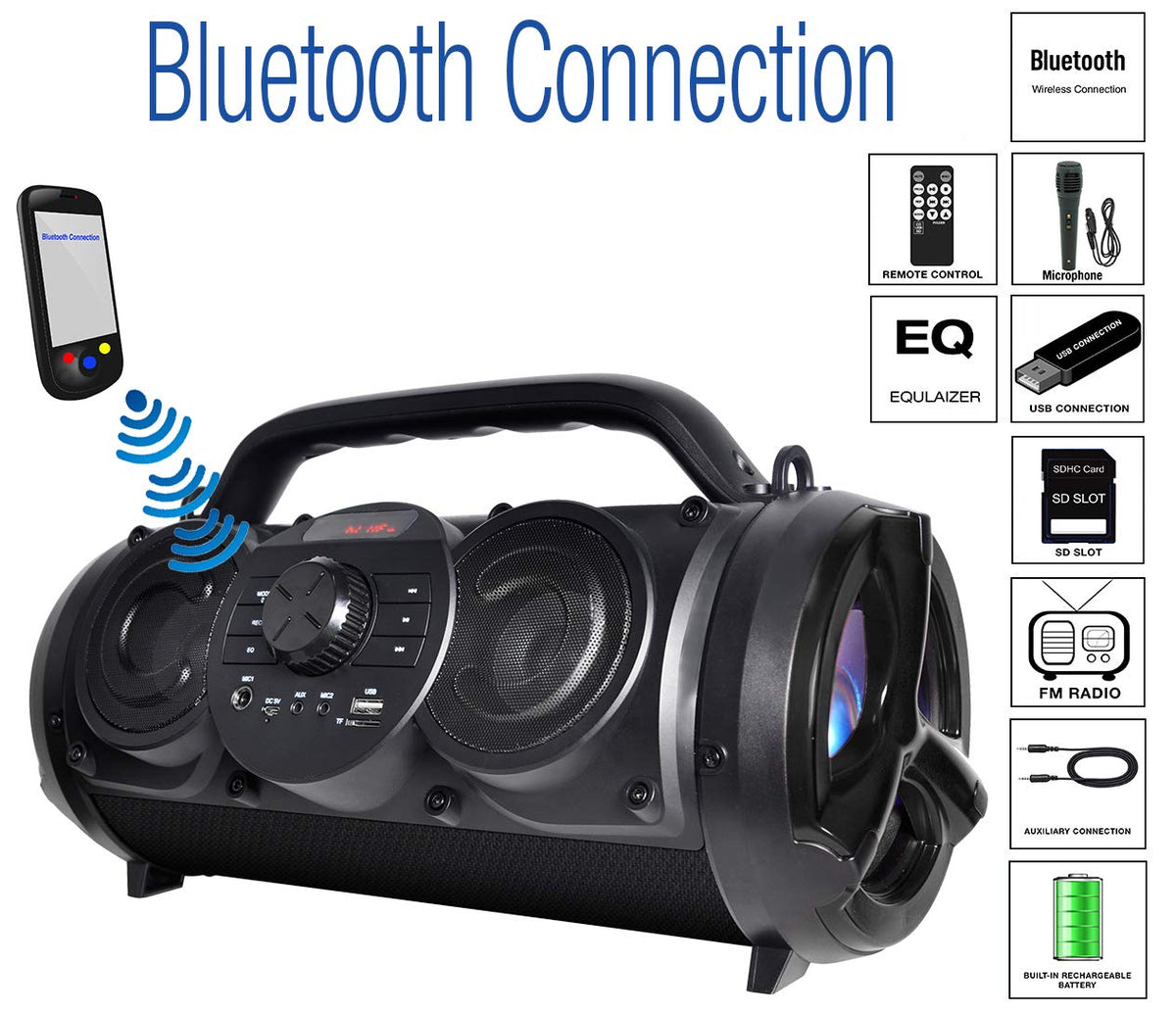 The Boytone Bt-18Bk Is The Perfect Portable Speaker. It Can Stream Your Music Wirelessly Through Bluetooth Technology. You Can Also Plug In Your Other Media Devices Using The 3.5Mm Jack. This Way You Can Listen To Anything, You Want. Provided With A Convenient Carrying Handle And Extra Strap That Makes It Easy To Grab And Take It Anywhere. There Are Two Microphone Jacks That Can Be Used, Comes With One Microphone One Auxiliary Cable, Giving You The Ability To Have A Traveling Karaoke Party With You Friends. Product Dimensions: 16' (406Mm) Long X 9.50' (241Mm) Height X 7.25� (184Mm) Wide. Built In Handle And Extra Strap For Easy Carrying. Does Not Matter If You Are At The Beach, Park Or In Your Backyard. You Can Always Start Singing With Your Friends And Family. Capable Of Recording Into Usb While Functioning In Karaoke Mode. The High Quality Speakers Provide A Rich Sound That Is Complimented By The Built-In 5' Subwoofer And 2 X 3.25' Tweeter. The Boytone Bt-18Bk Is Perfect For Playing Your Favorite Music Or To Sing Along With It Using The Bluetooth Connection. Output Power: 25 Watts. Boytone Bt-18Bk Comes With Usb Port, Micro Sd Slot, Wireless Remote Control And One Microphone With Echo Sound, Aux Jack And & Built- In Fm Antenna And More Than 70 Memory Stations For Fm Radio, Digital Display, 5 Inch Speakers 2 X 3.25'' Tweeters, Built-In Recharge Battery, Karaoke Function & Microphone Frequency Response: 150Hz---20Khz Speaker: 5'+3.25', 4O Distortion: =1% Battery: 1800Mah S/N Ratio: =80Db Input: Dc9V