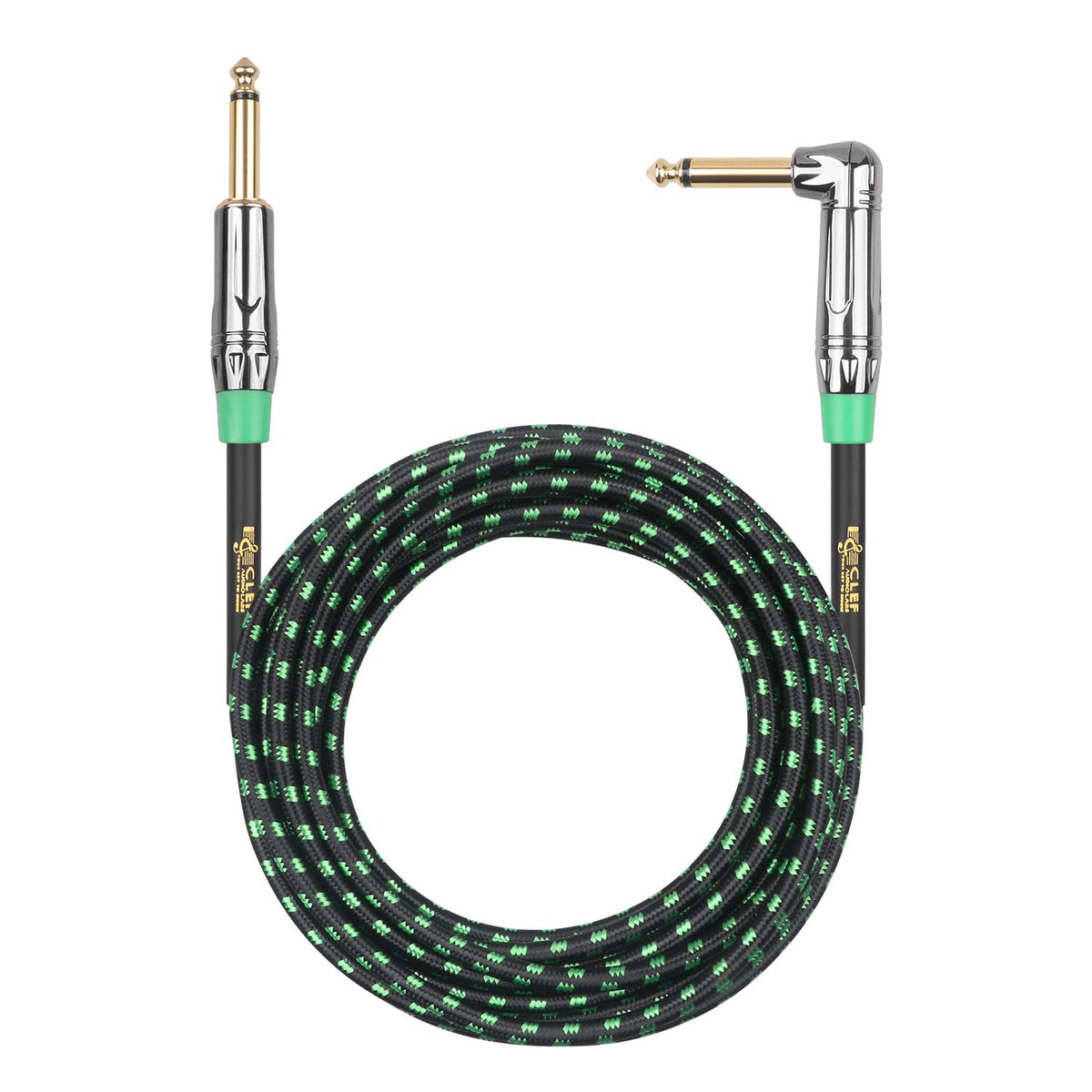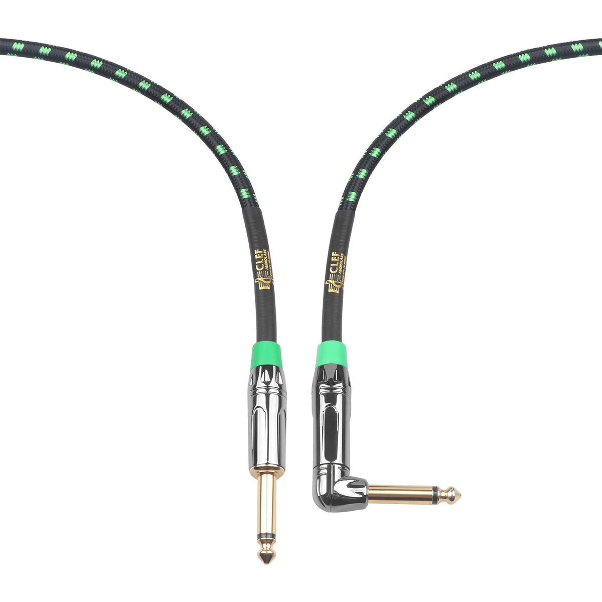 Clef Audio Labs 6.35Mm Ts To 6.35Mm Ts Straight To Angled, Black Chrome Zinc Alloy Shell/Green Braided 20Ft 1Pk