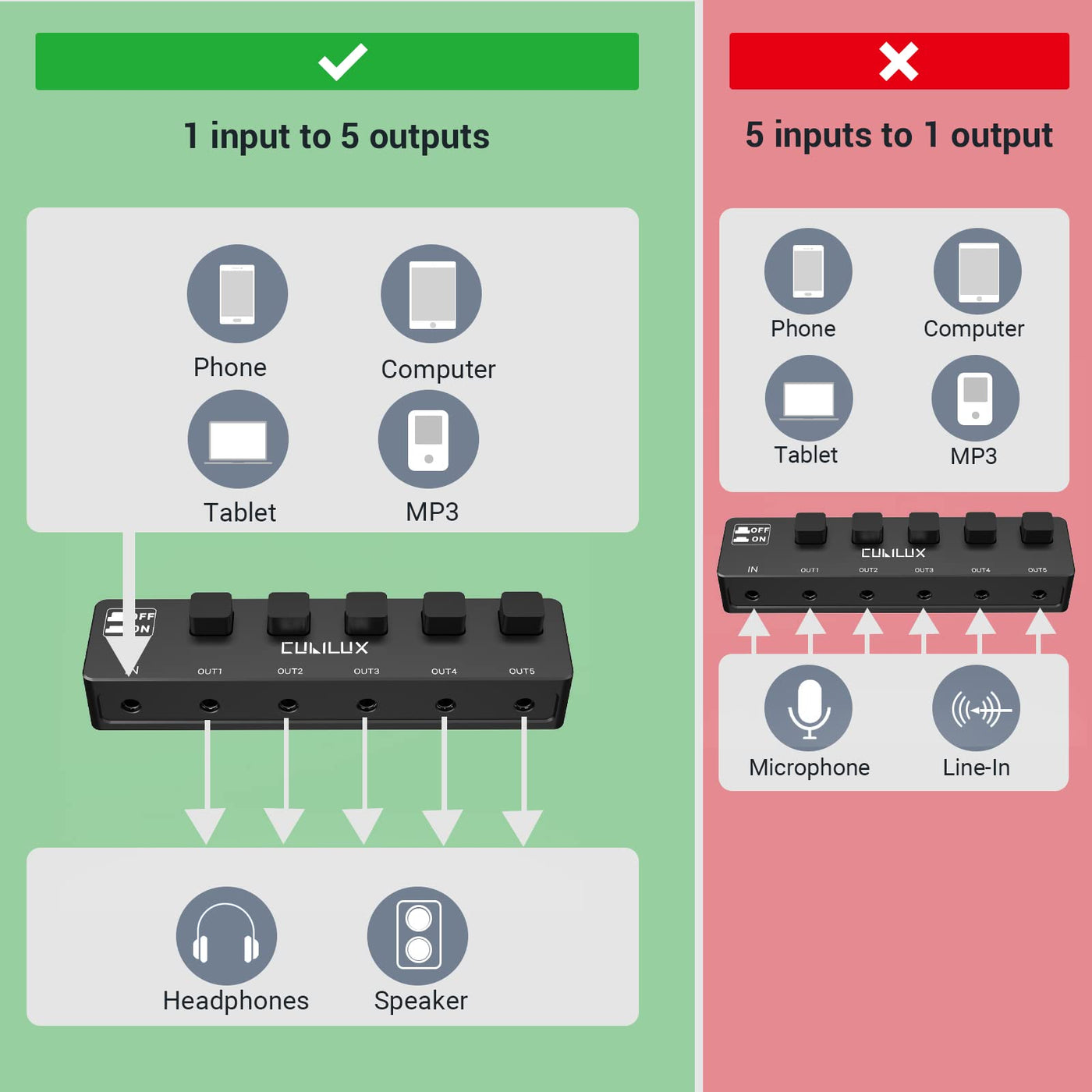 Cubilux 5-Channel Audio Splitter With Switch Control Cubilux Aux Splitter Is Perfect For Setting Up Multiple Speaker Audio Systems Or Sharing Music/Movies With Up To 5 People. No Need For Complicated Setup, Just Simply Plug And Play.