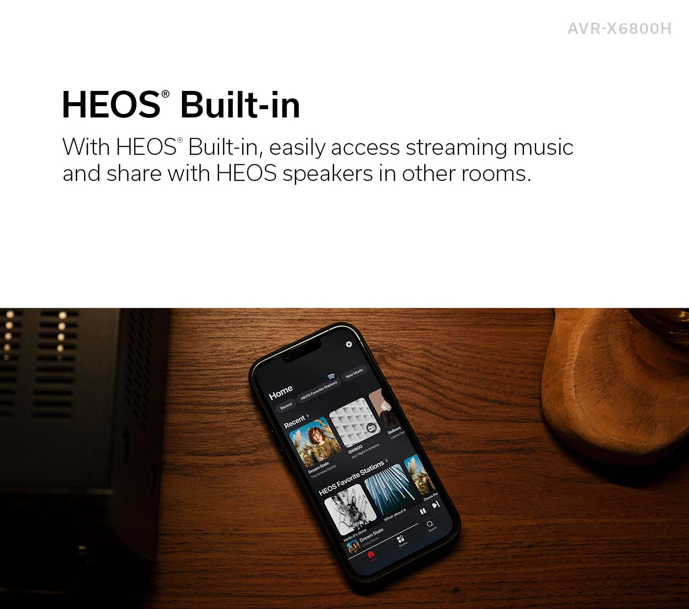 Q: How does the built-in HEOS multi-room streaming work?A: The built-in HEOS technology allows you to stream music in multiple rooms simultaneously or play different songs in each room. You can easily control the music from popular streaming services via Wi-Fi or Bluetooth, providing a versatile audio experience throughout your home.