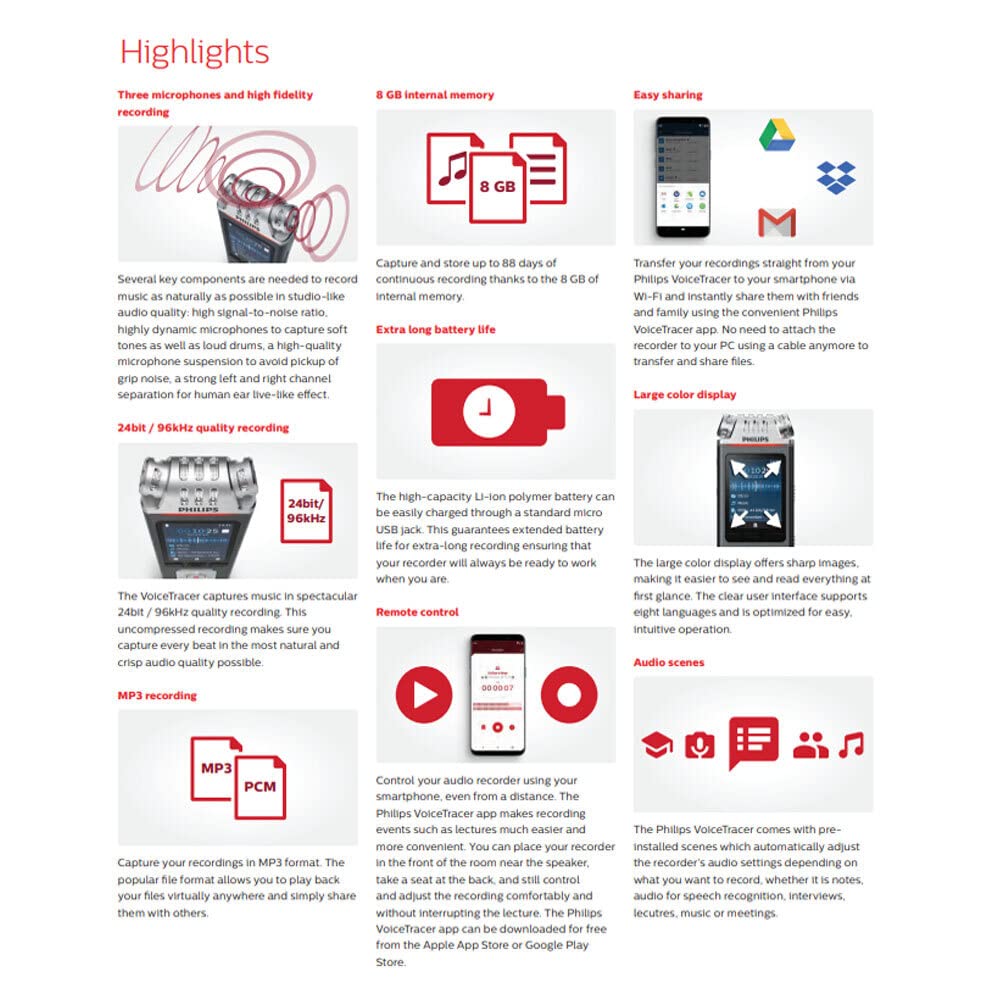 Record Music In Stunning Clarity With The All-New Philips Dvt6110 Voicetracer. Share Audio Files And Remotely Control The Dvt6110 Using An Intuitive Smartphone App. Seamlessly Navigate Through Files, Functions And Modes On The Voicetracer With Its Simple And Intuitive User Interface And Large Color Display. The Dvt6110 Can Be Tripod Mounted For Professional Live Music Recording Wherever You Need It.