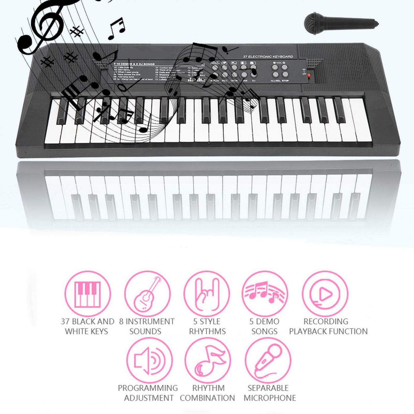 Feature: 1. 37 Key Electric Keyboard Is A Wonderful Musical Intelligence Toy To Cultivate Children'S Brain Consciousness 2. Come With A Microphone, You Can Sing While Playing The Piano, And Its Recording Function Can Record Your Own Voice At Any Time 3. This Electric Piano Possess 8 Tones, 6 Songs, 5 Rhythms, 5 Percussion Music With Adjustable Volume 4. Using And Environmentally Friendly Materials With Fine Workmanship, Smooth Edges Will Not Hurt Children'S Fingers 5. Portable Size And Dual Power Supply System (Usb Charging Or 3 X 1.5V Aa Batteries) Make The Keyboard Very Convenient For Outdoor And Indoor Use. Also Can Share With Mobile Phone Power Adapter