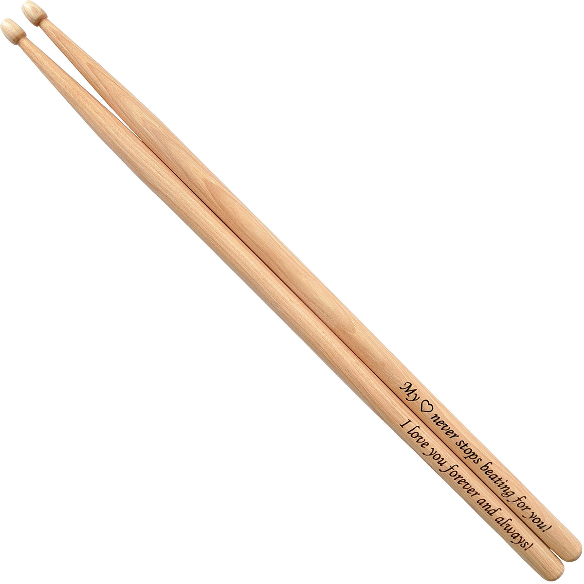 ?? These Wood Drumsticks With The Romantic Quote: ''My Heart Never Stops Beating For You! I Love You Forever And Always!'' Will Be A Perfect Gift For Lovers For Any Occasion. ?? The Drumsticks Are Hickory Wood Tipped And Of Great Quality. The Engraving Is A Nice Dark Color In Contrast To The Light Wood And Is Permanent. ?? These Are Standard Natural Multipurpose Drum Sticks Engraved One Line On Each Drum Stick. ?? Excellent Music Gift For All Music Lovers!