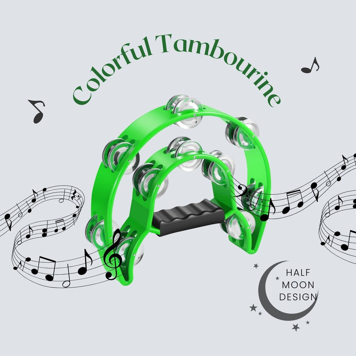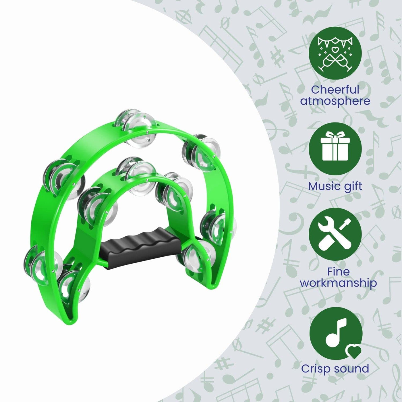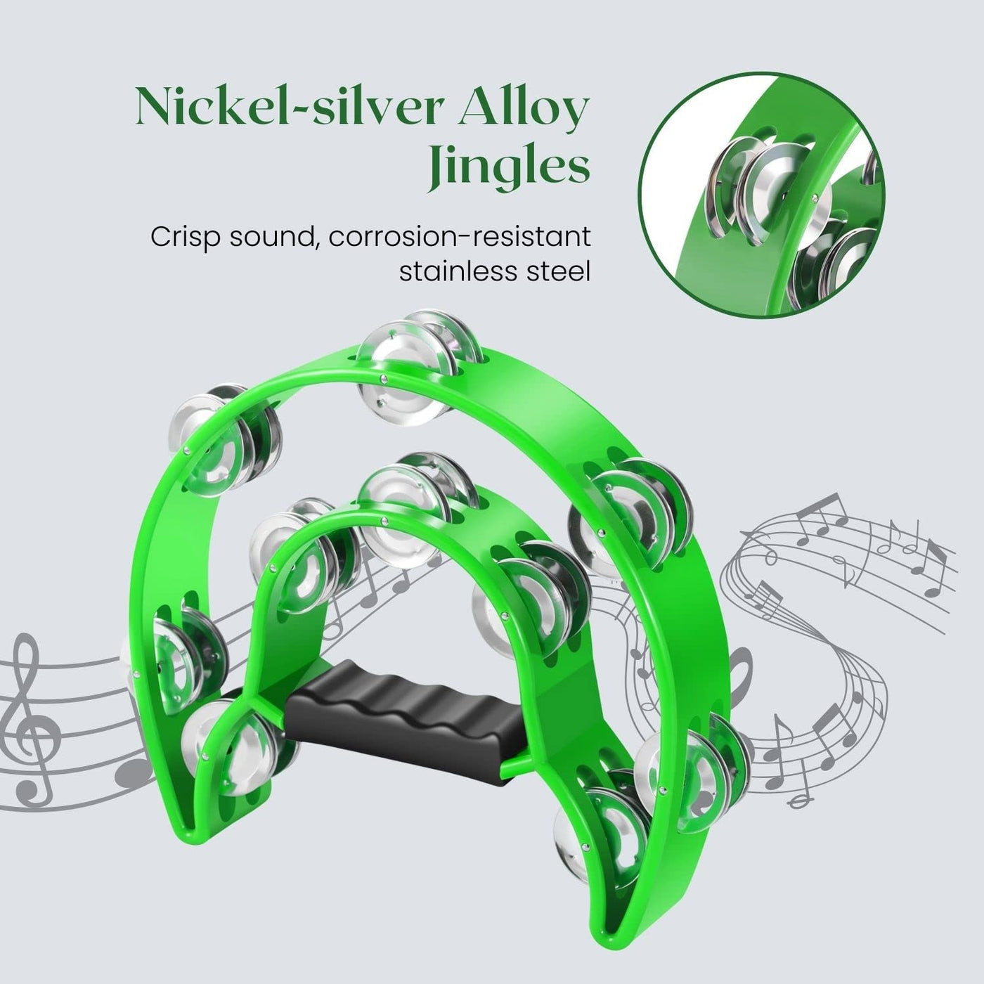 1X Tambourine Metal Half Moon Musical Instruments Double Row Metal Jingles Hand Held Instruments Percussion With Ergonomic Handle Grip, Tambourines For Adults, Green
