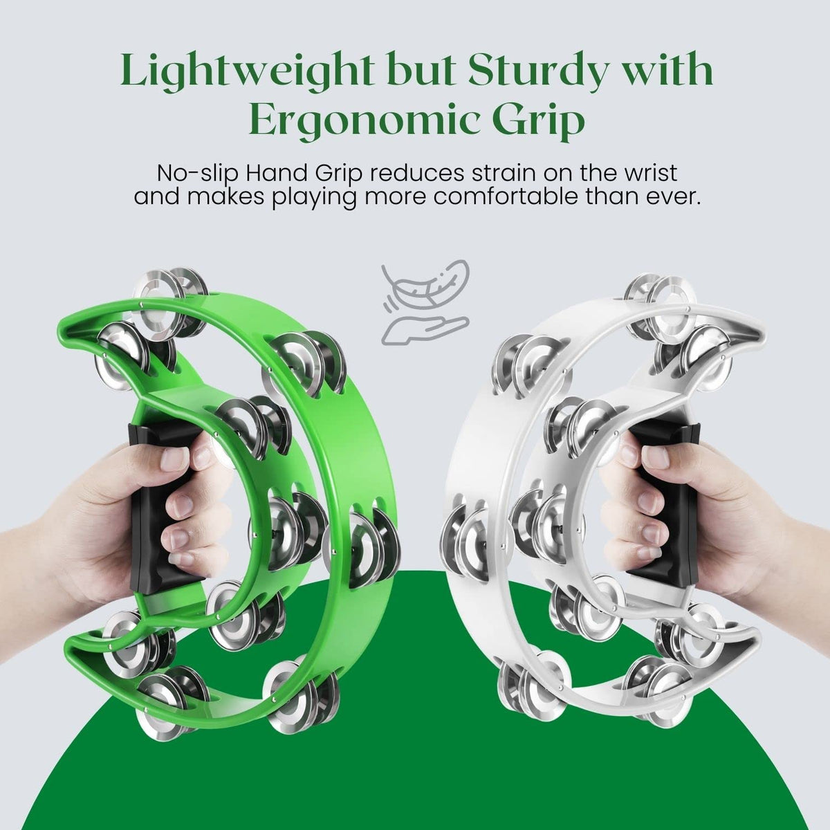 Flexzion Tambourine Metal Half Moon Musical Instruments Double Row Metal Jingles Hand Held Instruments Percussion With Ergonomic Handle Grip, Tambourines For Adults, Green