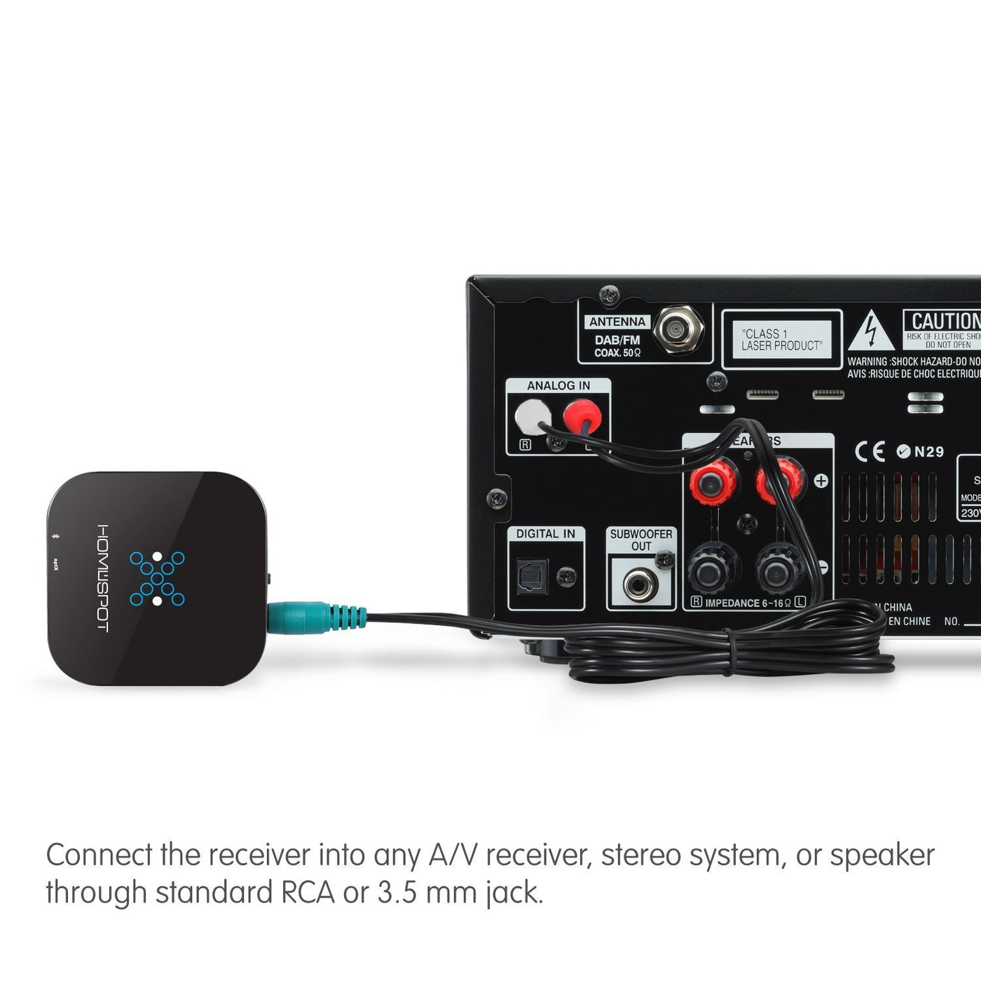 Hd Audiophile Audio Upgrade Your Home Stereo, Wired Hi-Fi Speakers, Or Wired Headphones With Bluetooth Technology, And Free Yourself From The Tangle Of Audio Cables. The Homespot Bluetooth Receiver Supports The Aac, Sbc And Aptx Codecs Which Deliver Premium Cd Quality Audio. Built In With Bluetooth 4.2 (Backward Compatible With 2.1+Edr) Technology Lets You Connect To Most Bluetooth Enabled Devices Without Draining Your Batteries. Freedom To Move Freely In Your House As You Listen, Conveniently Control And Stream Music From Up To 66 Feet / 20 Meters Away. Wide Reception Area The Long-Range Coverage Area Provides Hd Audio Reception To Receivers Up To 66 Feet (20M) From The Transmitter. Just Plug In, Pair And Play The Receiver Connects To Your Home Stereo Or Speakers Using The Included Rca To 3.5Mm Audio Cable Or 3.5Mm Aux Cable, And The Included Power Adapter Connects To Your Standard Wall Outlet. Simply Plug It Into Your Stereo, Then Connect To Your Device With Just One Press Of A Button. Connect Multiple Devices The Homespot Bluetooth Receiver Enables Two Users To Connect Simultaneously Via Multilink / Multipoint Technology. Once Connected Either User Can Play The Music Stored On Their Phone Via The Stereo System. True Wireless Speakers System Tws True Wireless Stereo System Two Homespot Bluetooth Receivers Can Be Connected To Each Other To Create A True Wireless Connection. You Can Stream Audio To Both Speakers Via Bluetooth For Synchronized Video-Audio Playback. Instant Auto Reconnection Pair Your Device With One Press Of The Convenient Pairing Button. Auto-Reconnect To Last Paired Device During Power-Up. The Re-Pairing Is Instant And Automatic For Hassle-Free Experience. Proprietary Bluetooth Name Identifier 2 Digits Identifier In Bluetooth Device Name For Multiple Rece