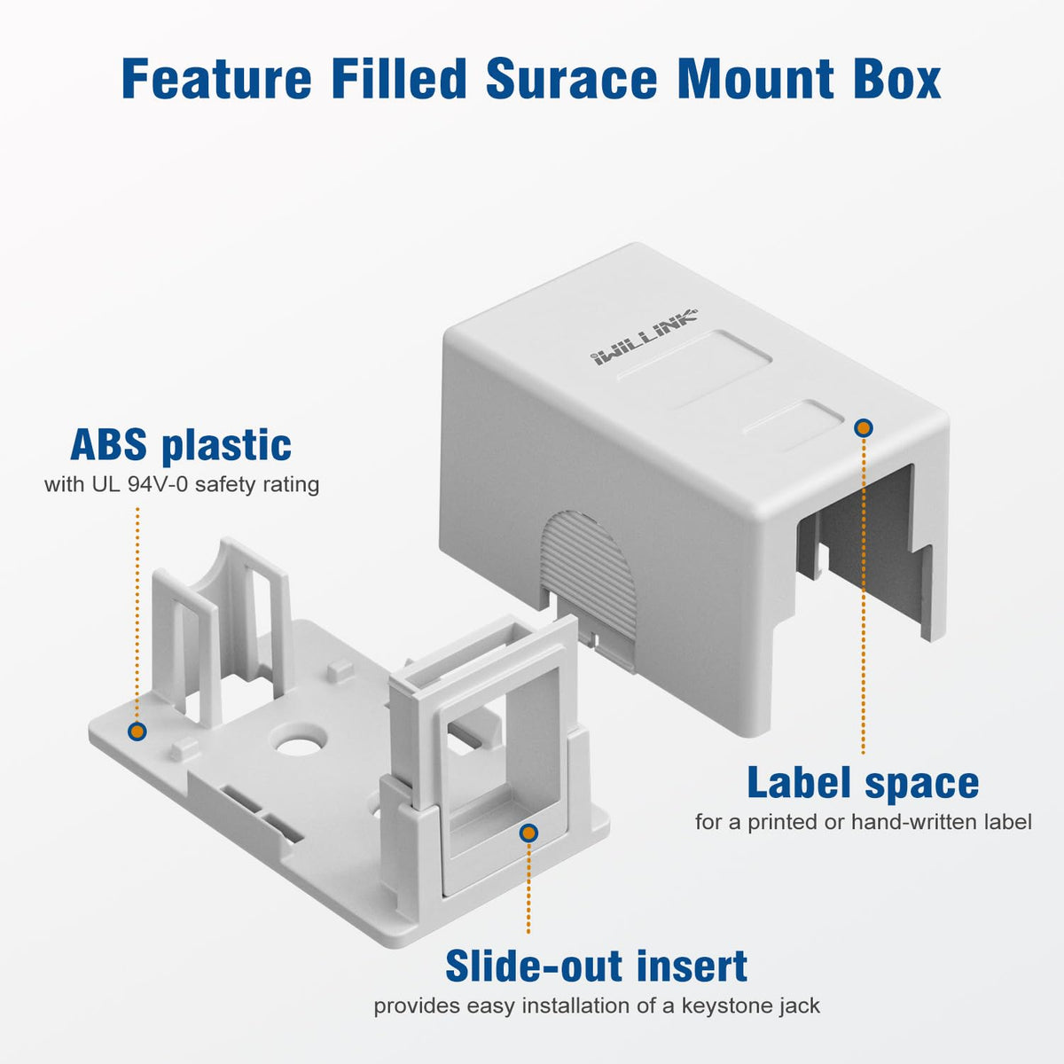 Q: What material is the iwillink surface mount box made from?A: The iwillink RJ45 Keystone Jack Surface Mount Outlet Box is made from a durable ABS shell that meets industry standard flammability ratings, ensuring safety and longevity.