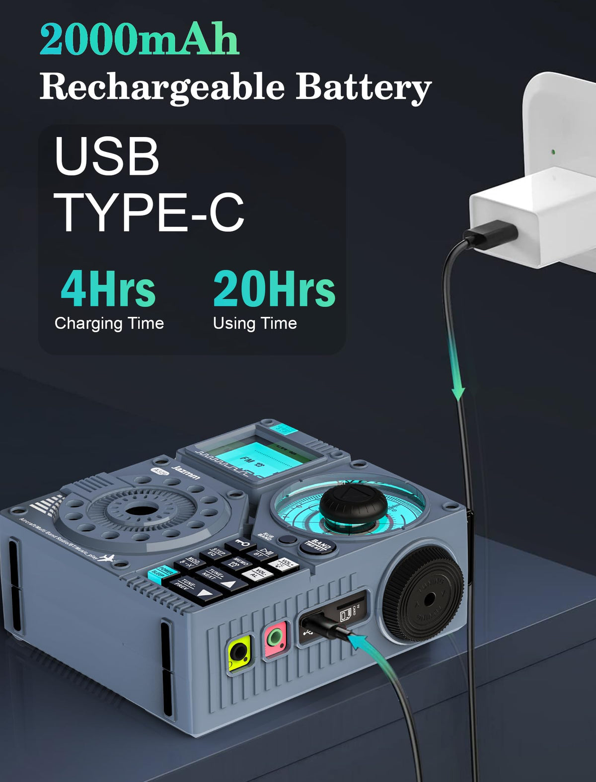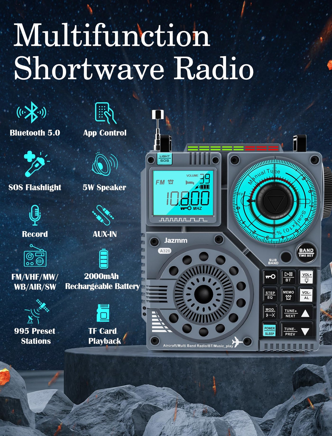 Jazmm Portable Shortwave Radio With 5W Bass Sound, Air/Am/Fm/Vhf/Sw/Wb Worldband Radio With Bluetooth And App Control, 2000Mah Rechargeable Radio With 9.85 Ft Wire Antenna,Flashlight,Recording