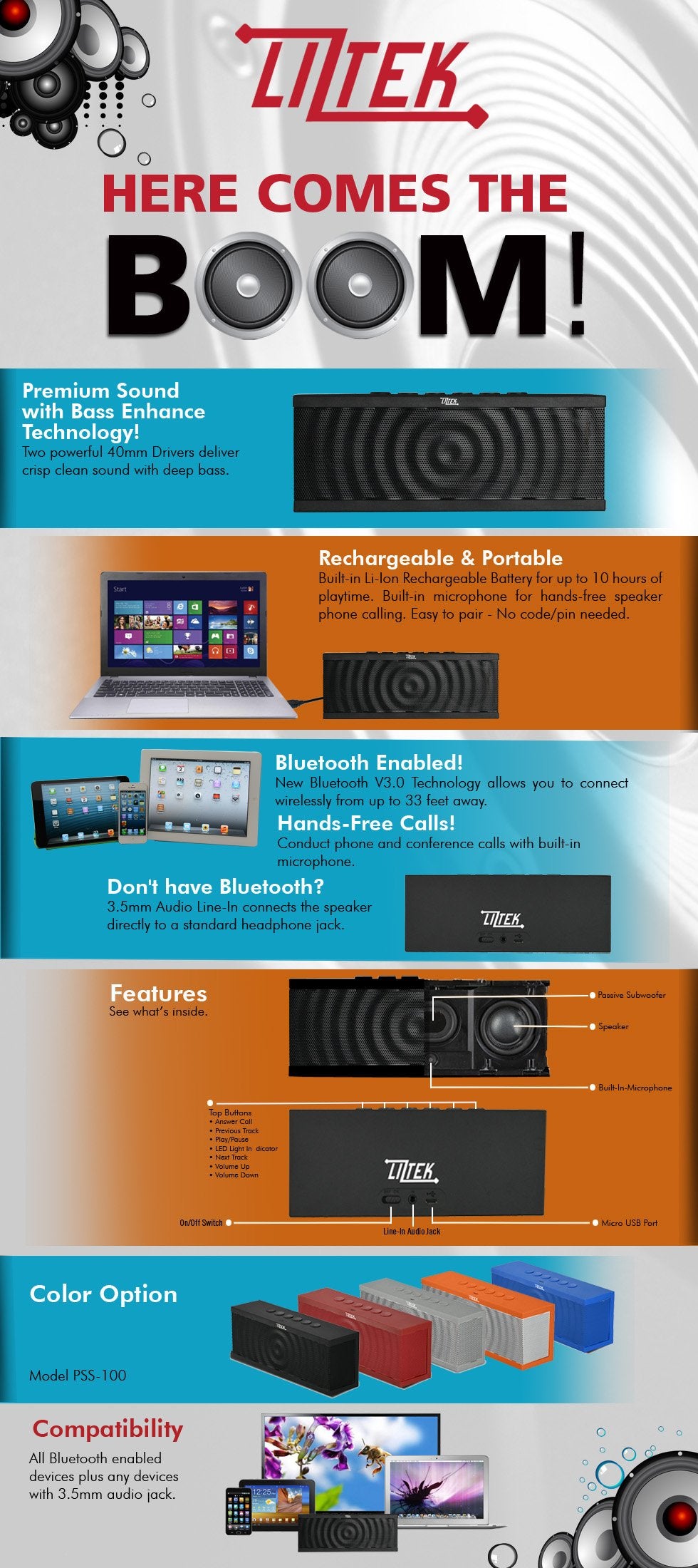 Liztek Pss-100 Portable Wireless Bluetooth Speaker With Bluetooth 3.0 And Bass Enhanced Technology Delivers A Premium Deep And Rich Sound In A Portable Size Package. Connect Wirelessly Smartphone, Ipad And Other Bluetooth Enabled Devices Up To 33 Feet Away While Enjoying High Definition Quality Sound With 10 Hours Of Continuous Playtime, Plus Hands Free Phone And Conference Calls With Built-In Microphone. Black