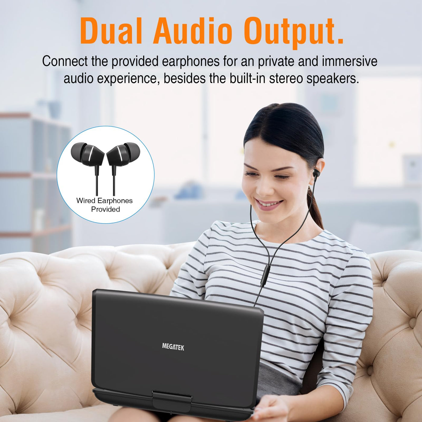 Q: What is included with the Megatek Portable DVD Player?A: The Megatek Portable DVD Player package includes the player itself, headphones, a car headrest mount, a car charger, an AC power adapter, and a full-function remote control for easy operation.