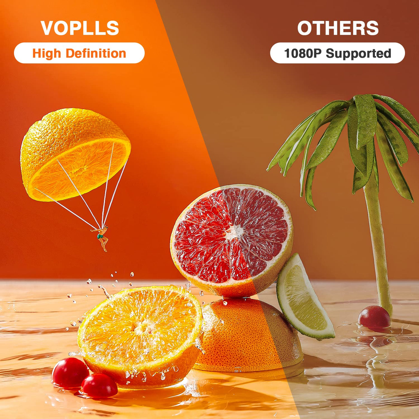 2023 Upgraded Hd Video Projector]: Voplls Upgraded Home Projector With Latest 7500 Lumens Led Light Source And 1080P Full Hd Supported Resolution, Adopts Advanced Led And Uniform Illumination Technology, Which Make The Edges Of The Projection Brighter And Clearer These Ensure The Projection Image Quality Presents A Real, Dynamic, And Color-Vibrant Effect Mini & Portable Projector]: Voplls Mini Projector Has A Unique And Compact Design With Size Of 669X49X264 Inches And Weight Of 14Lb This Portable Projector Can Be Put In Your Handbag For Traveling And Camping Wherever You Are Voplls Mini Projector Is Extremely Delicate But Can Pack A Surprising Amount Of Visual Punch Hi-Fi Stereo Sound & Noise Reduction]: Built-In Hi-Fi Stereo Speakers, Voplls Video Projector Provides Original Audio Fidelity With Crystal Clear Sound Quality Also Featured With Audio Output Port To Connect Headsets Or Speakers As You Please To Enhance Your Viewing And Sound Experience Using The State-Of-The-Art Noise Reduction Technology, The Fan Noise Of Voplls Movie Projector Is Reduced By 80%, And The Heat Dissipation Is More Effective Big Projection Size]: 210 Inch Large Projection Screen Brings An Immersive Viewing Experience Voplls Phone Projector Allows You To Enjoy The Happy Home Theater Time With Your Family Both Indoor Or Outdoor The Outdoor Projector Provides A Projection Size From 35A To 210A With The Projection Distance Between 37Ft To 236Ft Multiple Devices Connection]: Voplls Mini Projector Is Fit For Playing Videos, Tv Series, Photos Sharing, Football Matches Etc It Can Be Easily Connected With Laptops, Smart Phones, Tablets, Usb Drives, X-Box To Make Entertainment More Exciting When Connecting With The Phone, Please Purchase An Extra Hdmi Adapter Due To Copyright Of Apps, Netflix, Prime Video, Hulu, Etc Can Only Be Played Via Tv Stick, Roku, Etc